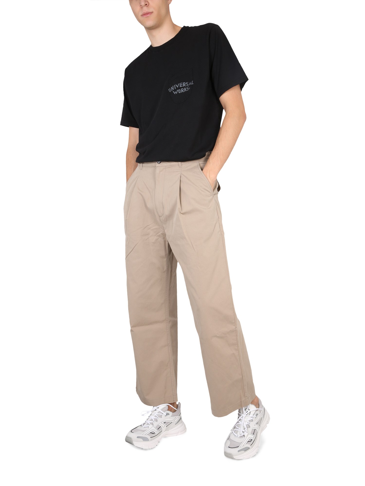 Questi pantaloni da marinaio in cotone organico di Universal Works sono un modo comodo ed elegante per rendere il vostro guardaroba un po' più ecologico. Questi pantaloni sono realizzati in cotone organico al 100% e sono comodi e morbidi al tatto. La chiusura con bottoni e cerniera aggiunge un design unico che vi permetterà di indossarli con una varietà di abiti diversi.