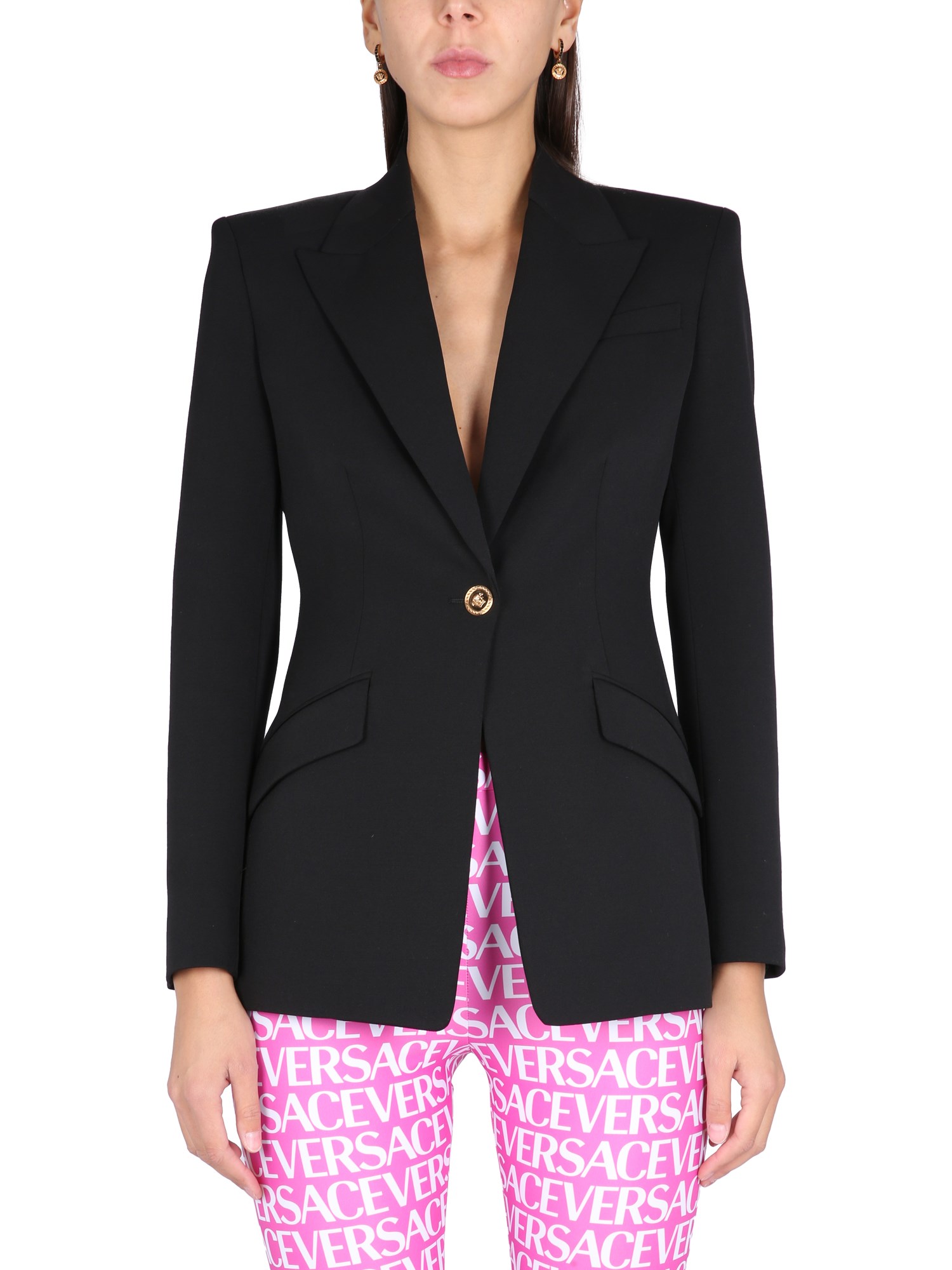 Versace propone una rivisitazione moderna del classico cappotto tradizionale. Ha rever a lancia e una chiusura a bottoni su un lato, con due chiusure laterali a patta sull'altro lato. È realizzato in lana e in elastan, quindi è molto comodo e vi terrà al caldo in inverno.