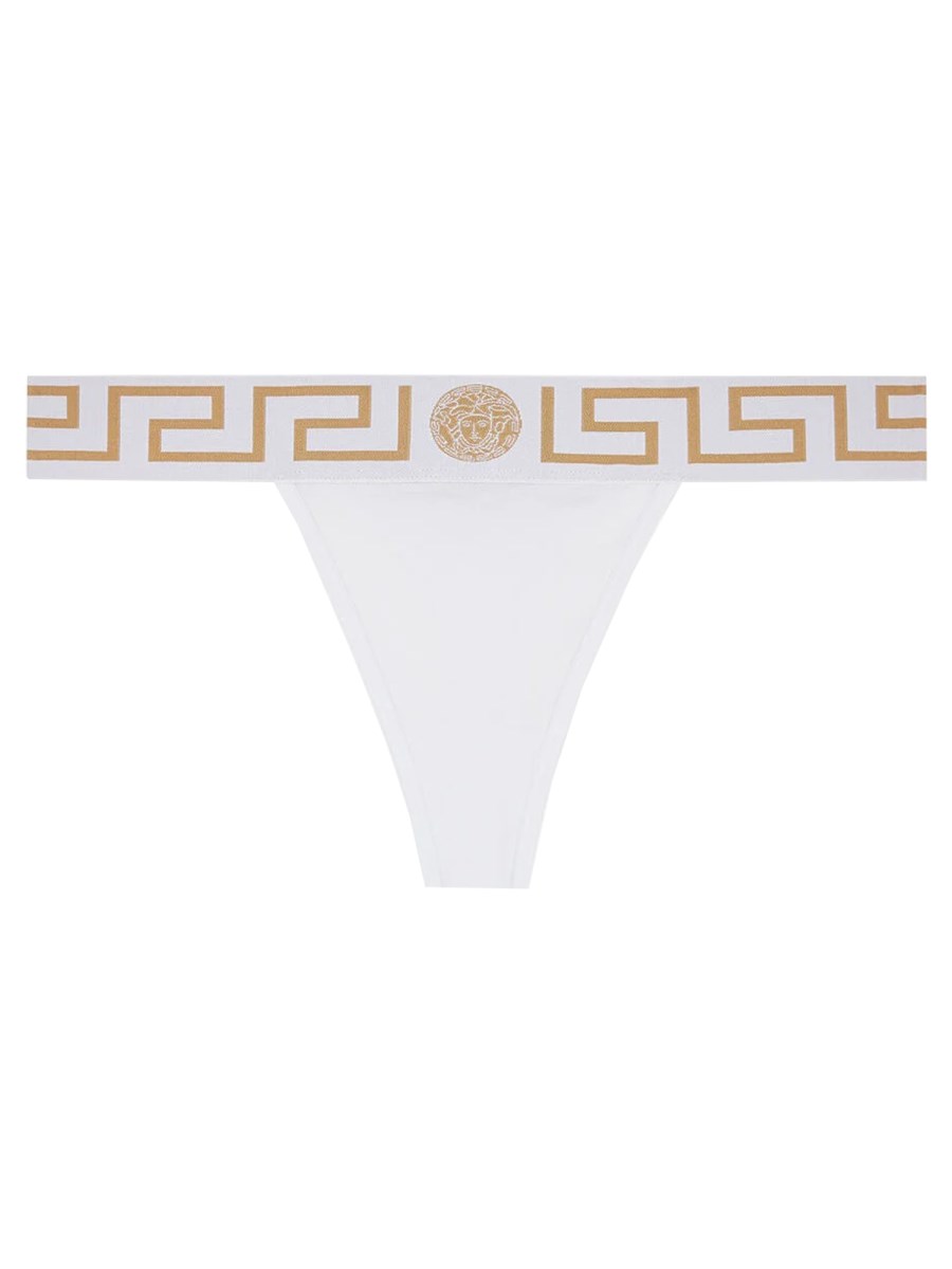 Questo perizoma in cotone elasticizzato con logo Versace è un set perfetto per chi ama indossare biancheria intima confortevole. L'elastico in vita si adatta a un'ampia gamma di taglie, mentre il perizoma si adatta alla vita e rimane in posizione grazie all'elastico.