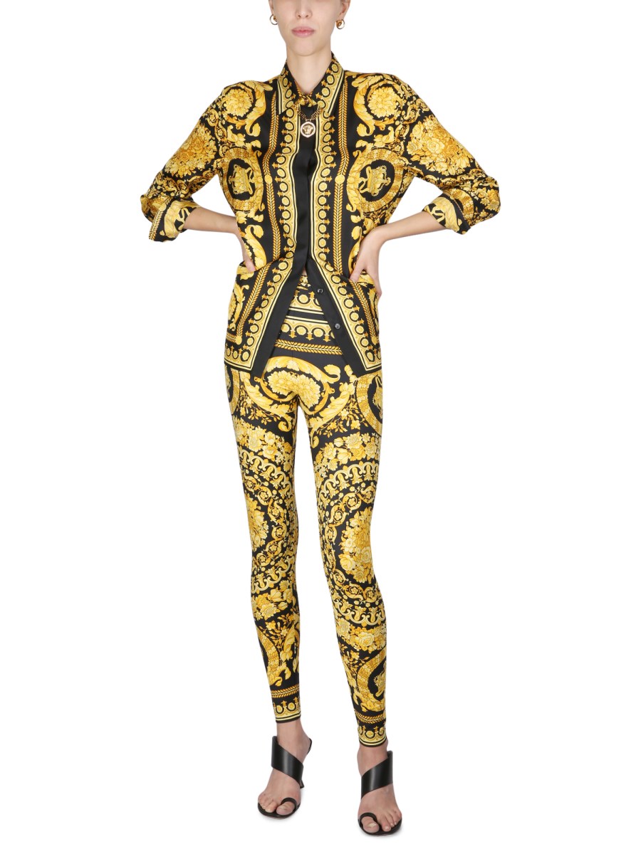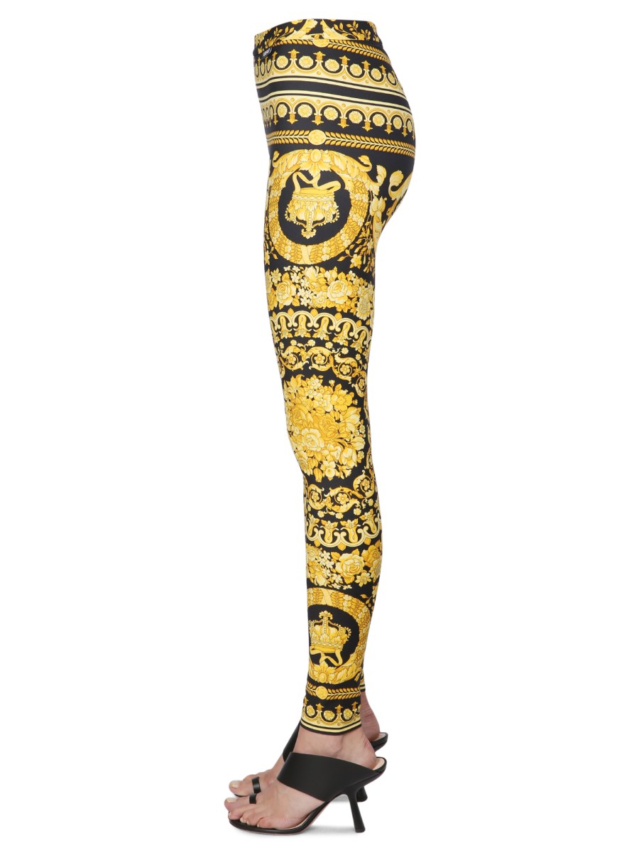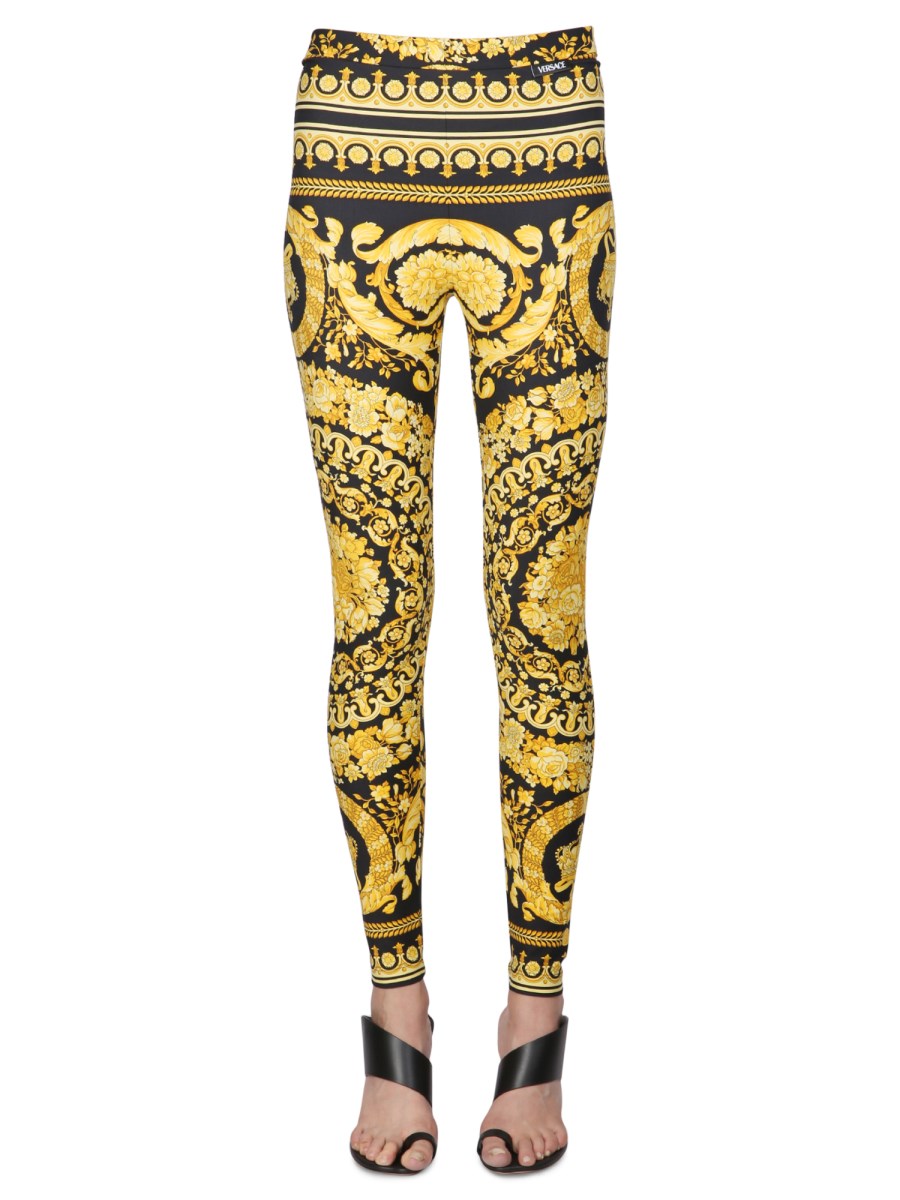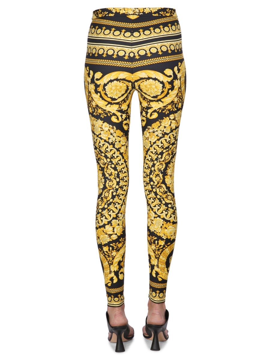 Abbinate questi leggings con fascia elastica in vita di Versace a qualsiasi outfit per un aggiornamento chic. Questi leggings sono realizzati in morbido tessuto elasticizzato che si adatta come una seconda pelle. Sono caratterizzati da una stampa barocca all-over e da un elastico in vita che garantisce comfort e vestibilità slim.