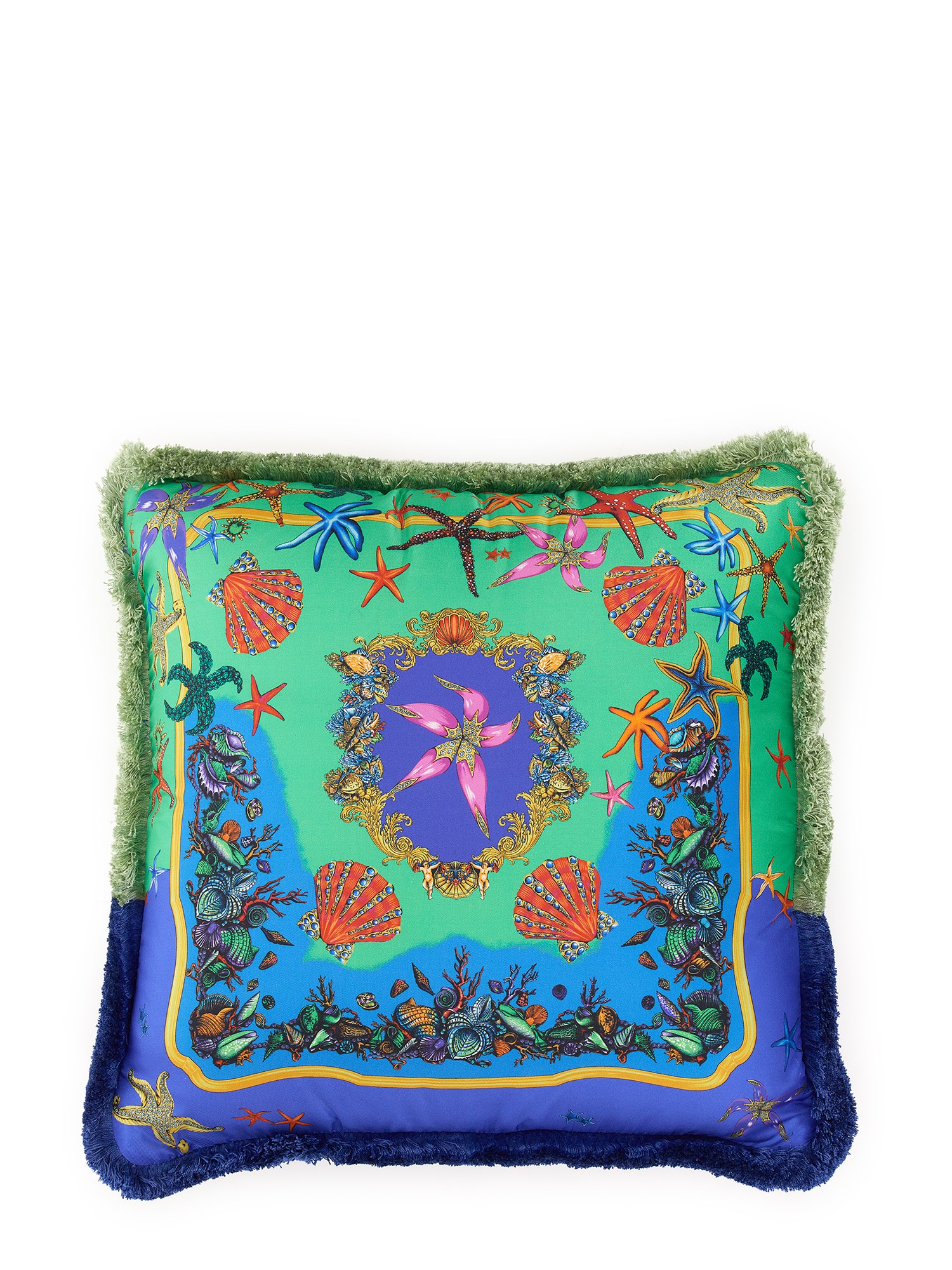 Questo lussuoso cuscino di Versace ha colori contrastanti e bordi sfrangiati che corrono intorno al cuscino per un look elegante. Questo lussuoso cuscino è realizzato a mano con seta naturale al 100% e porterà sicuramente un senso di raffinatezza e ricercatezza in qualsiasi camera da letto.