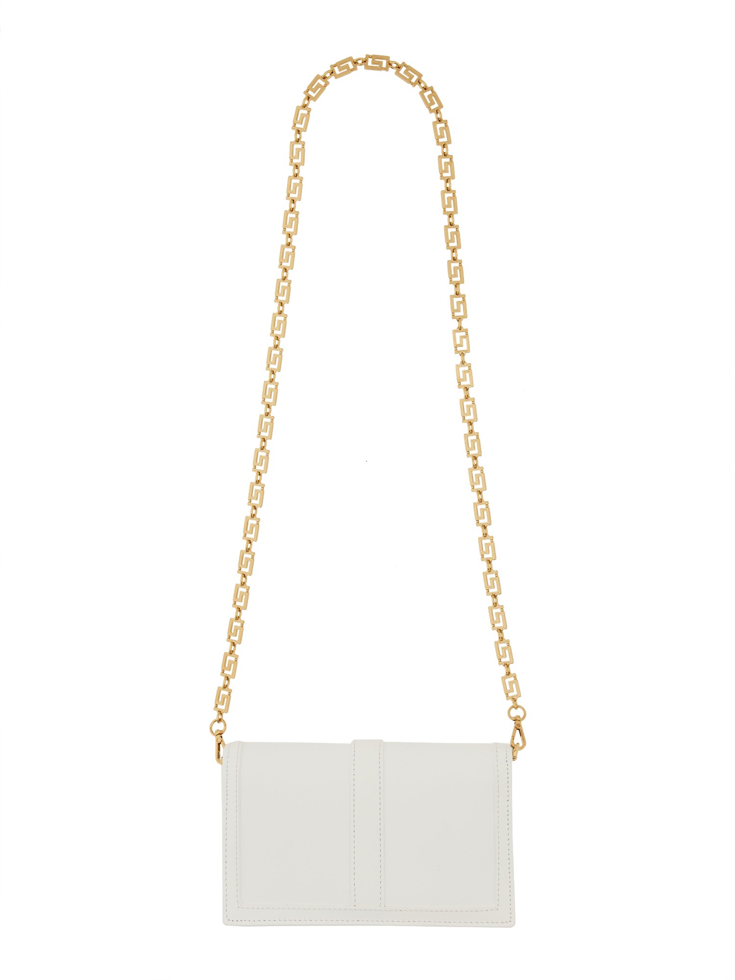 Questa borsa di Versace combina un'eleganza senza tempo con un tocco di modernità. Realizzata in pregiata pelle bianca, questa borsa emana lusso e raffinatezza. La texture liscia aggiunge un tocco raffinato, garantendo al contempo una lunga durata. La tracolla a catena dorata aggiunge un tocco di glamour, accentuando senza sforzo il vostro stile. Indossatela sul corpo per un look chic e a mani libere, oppure raddoppiate la catena per un look più corto e formale.