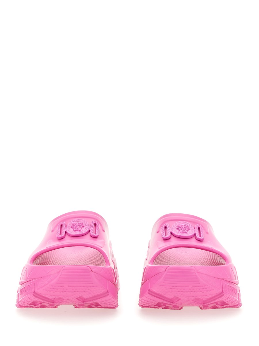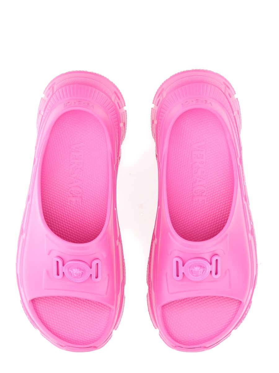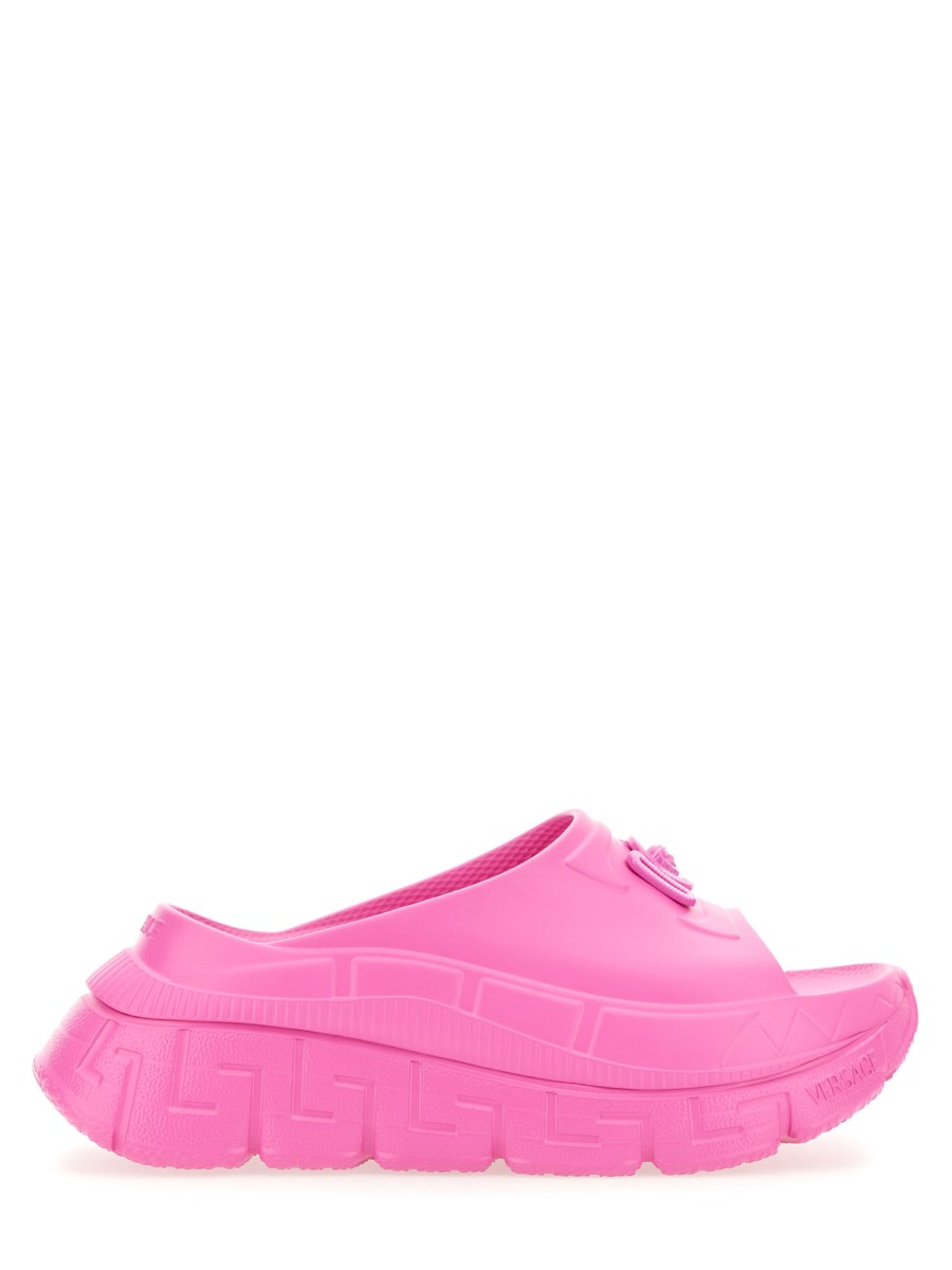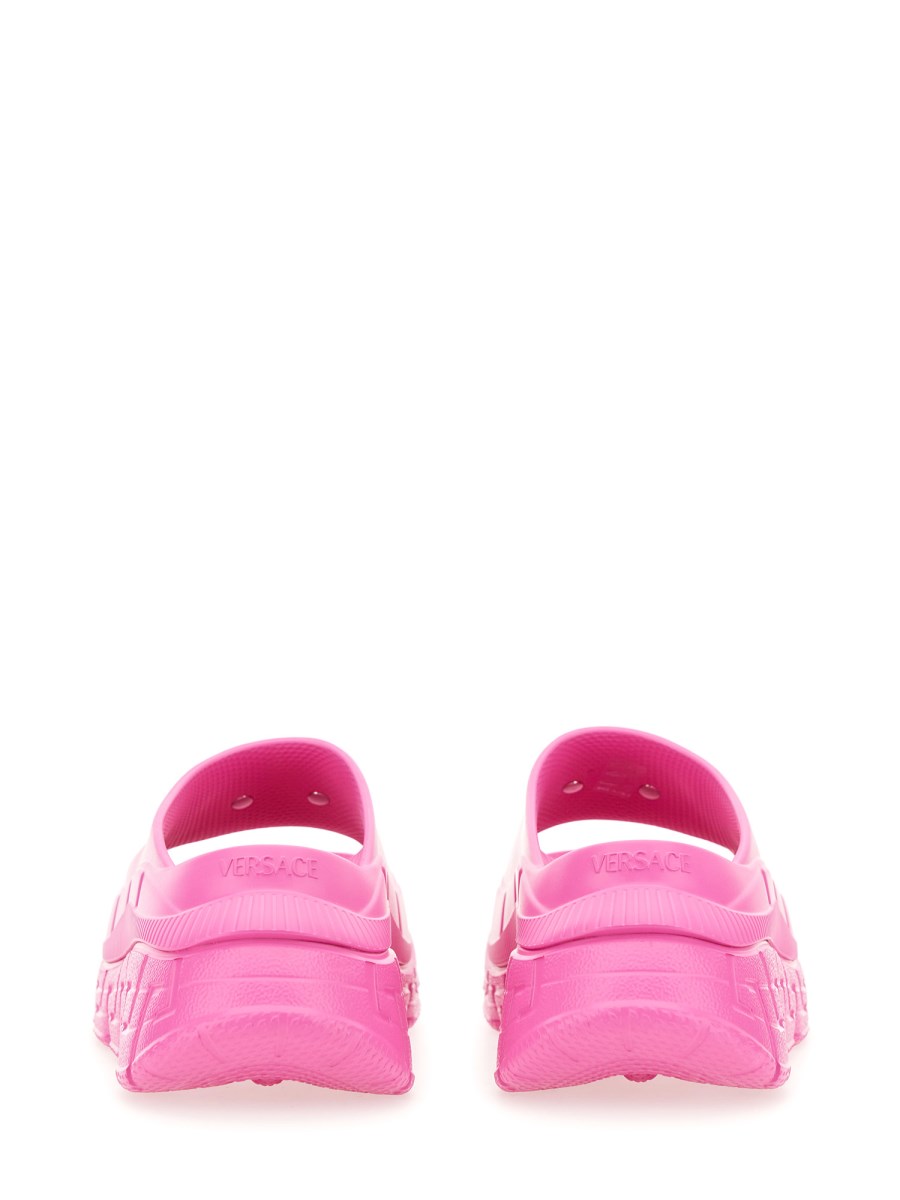 Queste slides sono realizzate in gomma e presentano l'hardware Medusa '95 tonale sul cinturino anteriore, con esecuzioni tridimensionali della Greca sui lati.