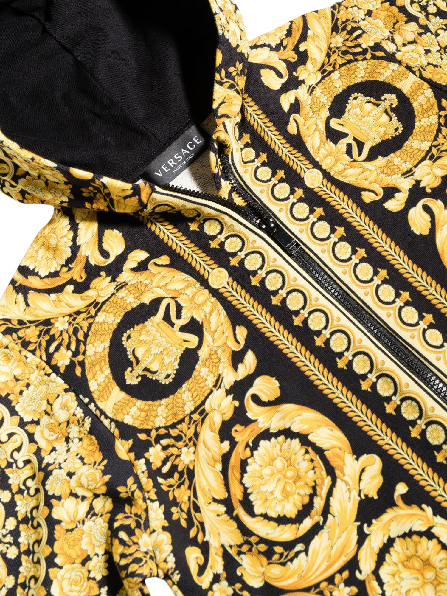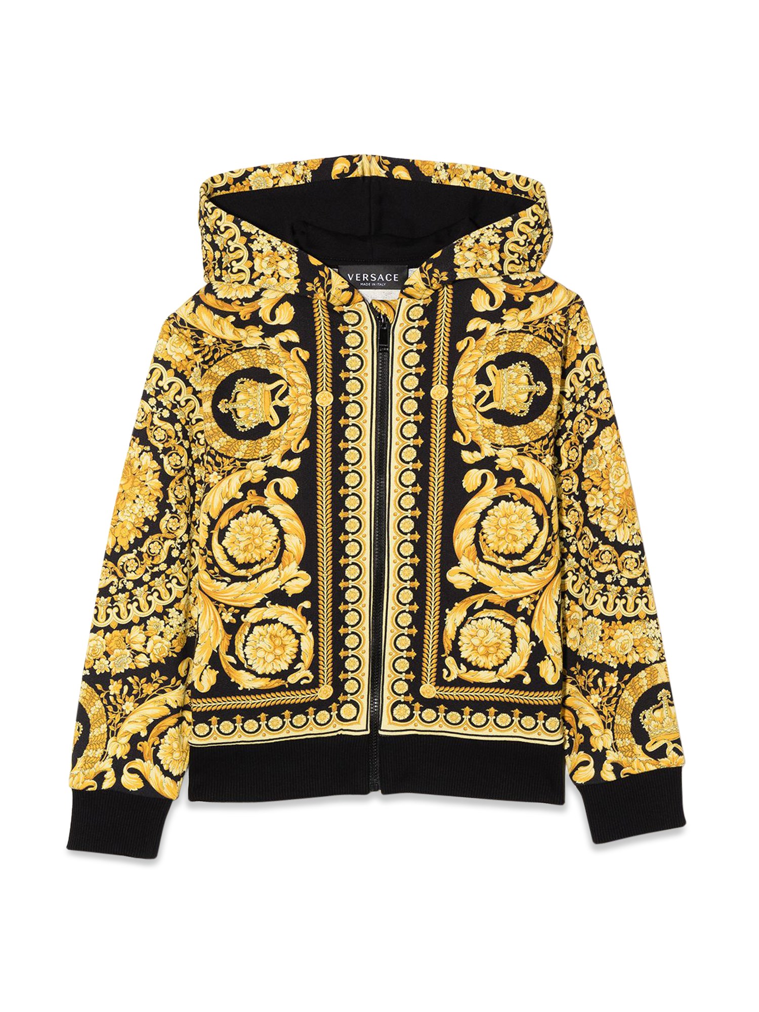 La felpa della maison Versace è un classico per le stagioni fredde e ha un peso perfetto per essere indossata a strati. Ha uno scollo con cappuccio, maniche lunghe con polsini a costine e orlo dritto a costine. La felpa, dalla vestibilità regolare, presenta una chiusura frontale con cerniera e una stampa all-over per un tocco di stile.