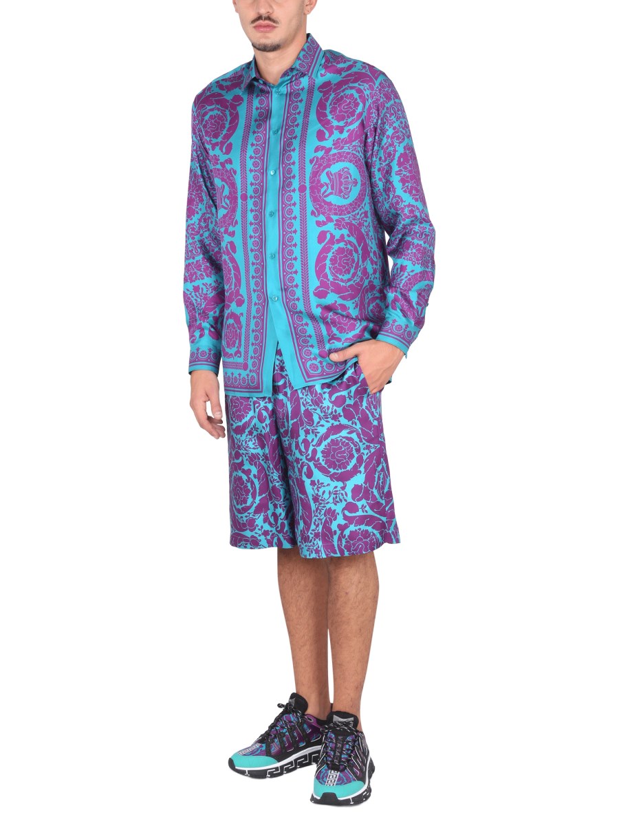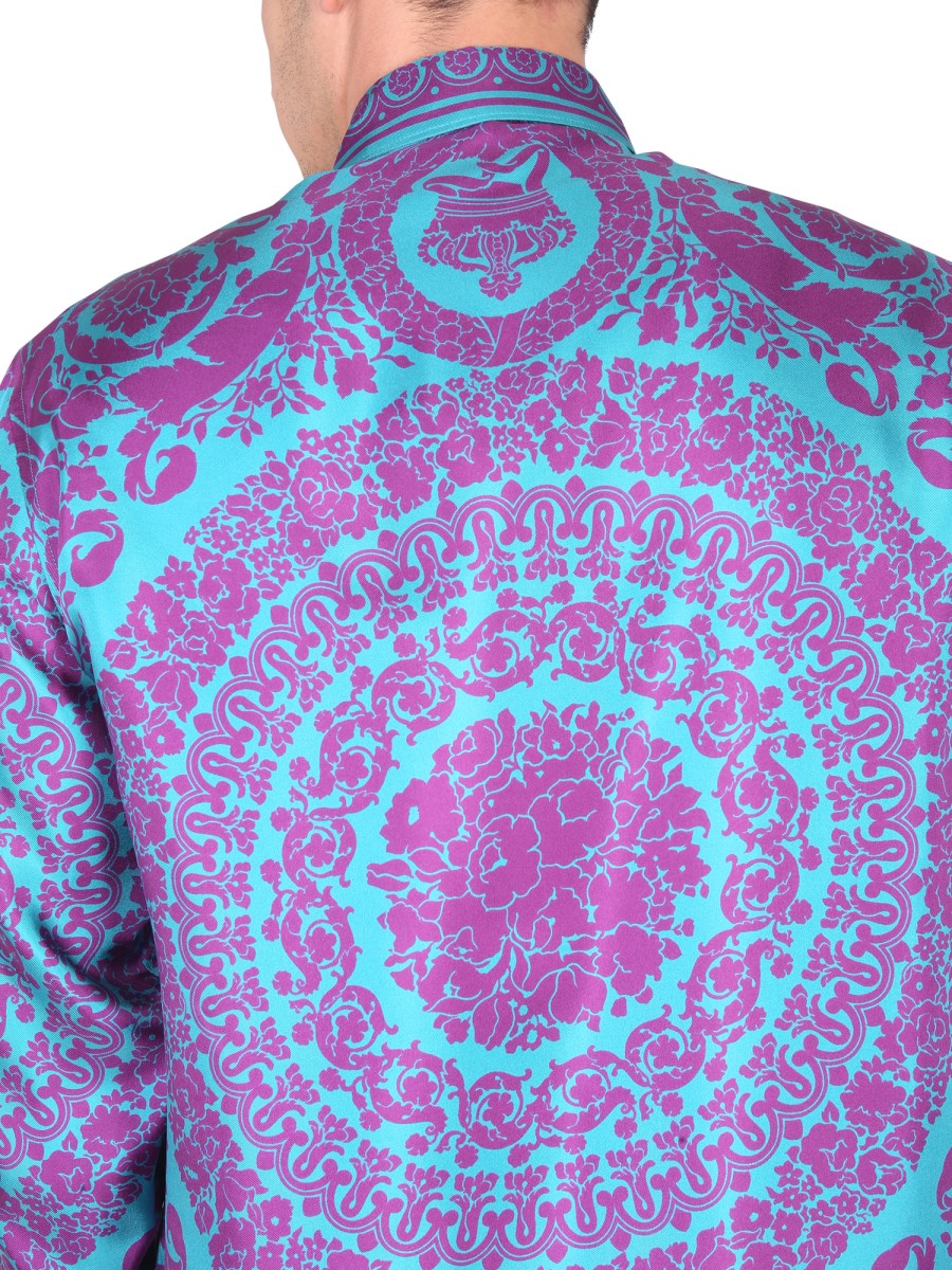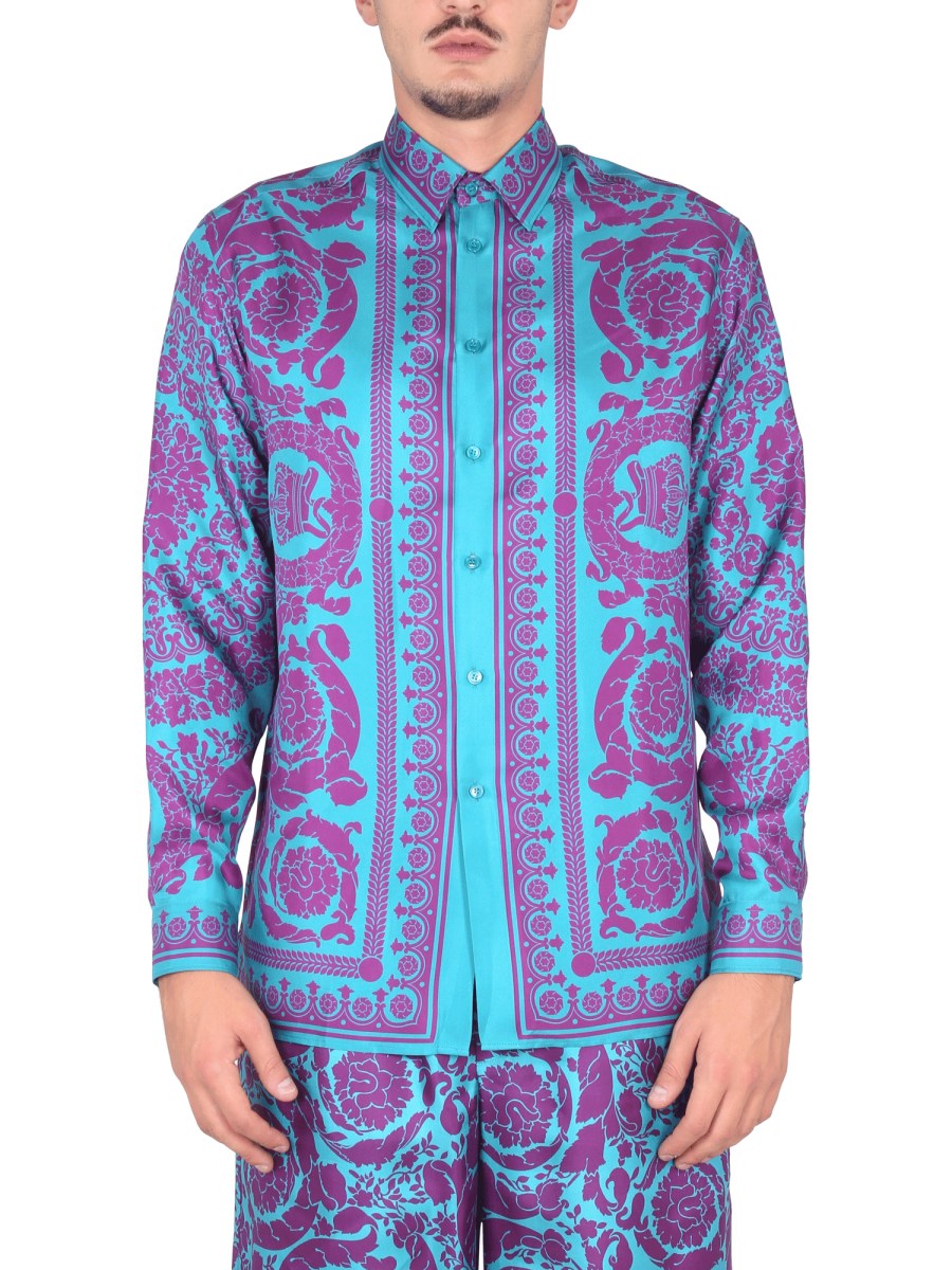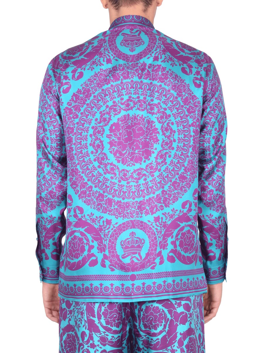La camicia Barocco in seta è una camicia a maniche lunghe della maison Versace realizzata in seta pregiata, con colletto a punta. È dotata di polsini con bottoni; la fascia di chiusura frontale con bottoni è impreziosita da un'accattivante stampa barocca all-over. Questa camicia è perfetta per essere indossata nelle giornate calde e per essere vestita per una serata fuori.