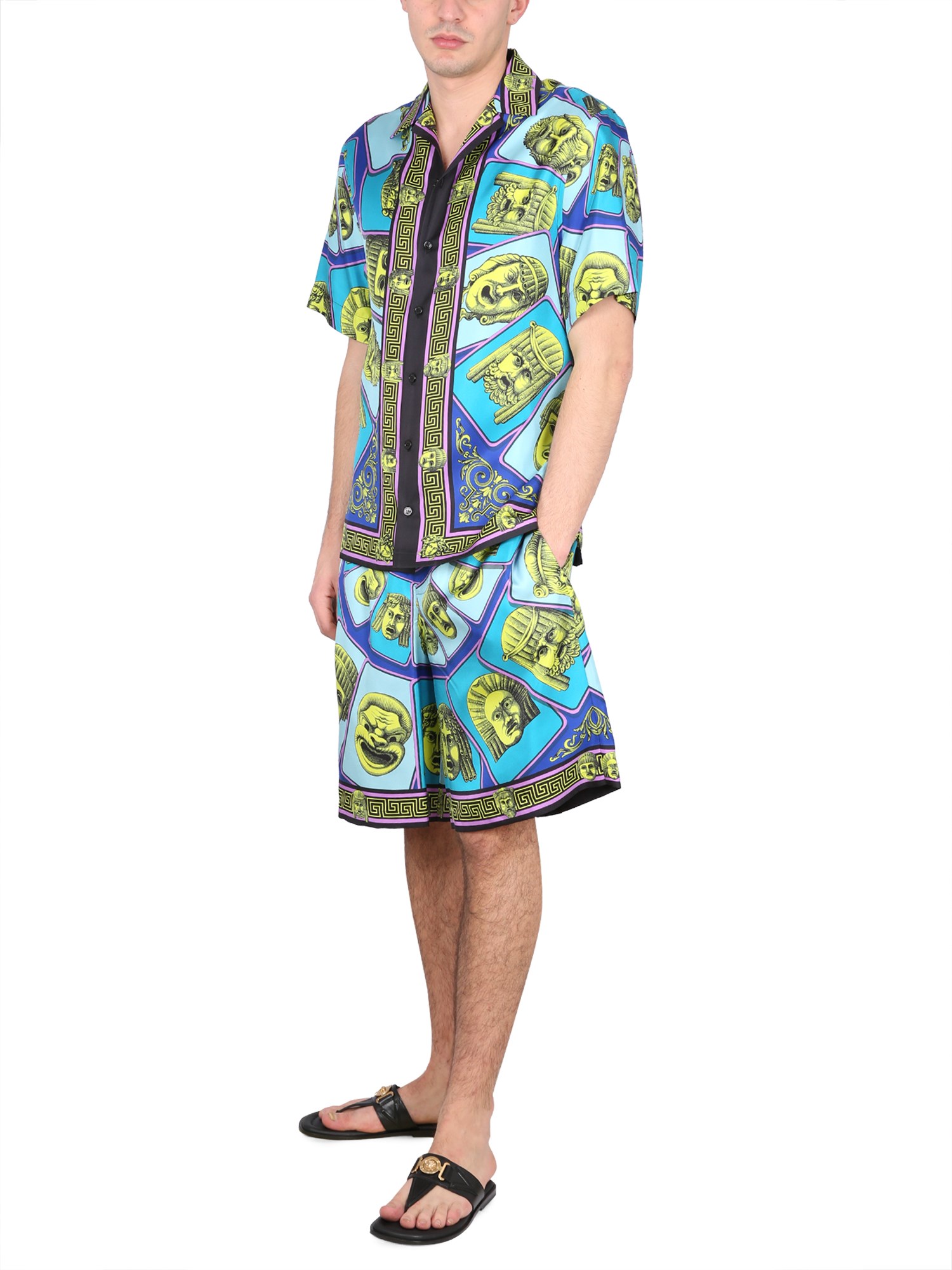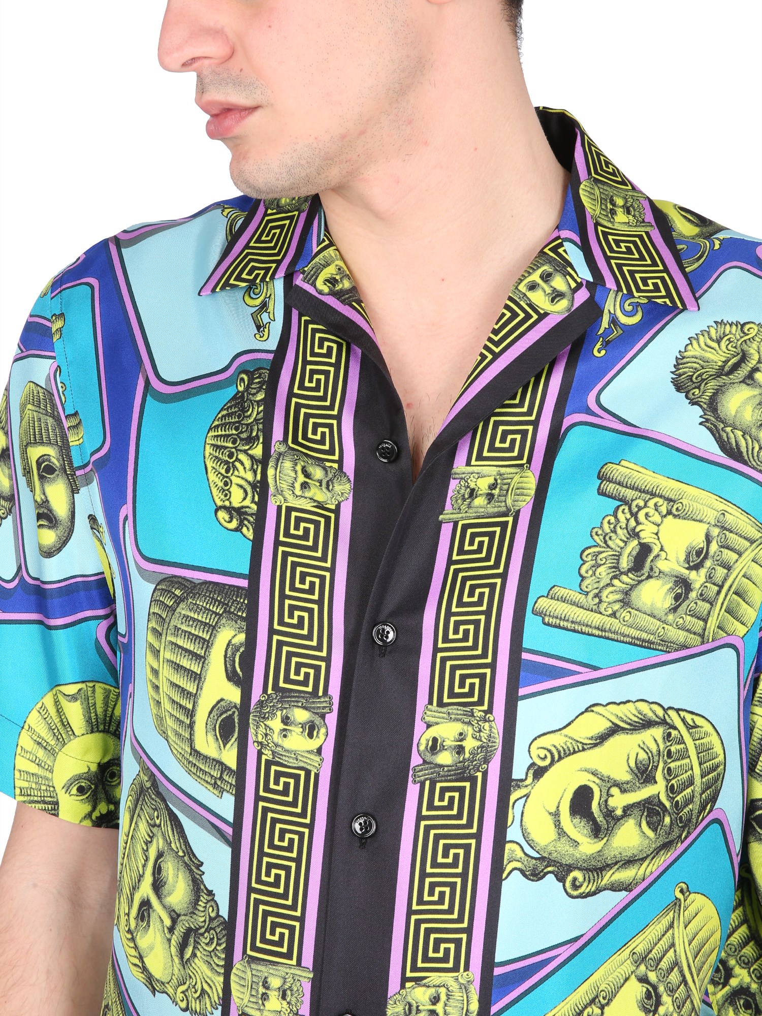 Questa camicia in twill di seta a maniche corte ha un colletto aperto e rilassato ed è caratterizzata dalla stampa Le Maschere.