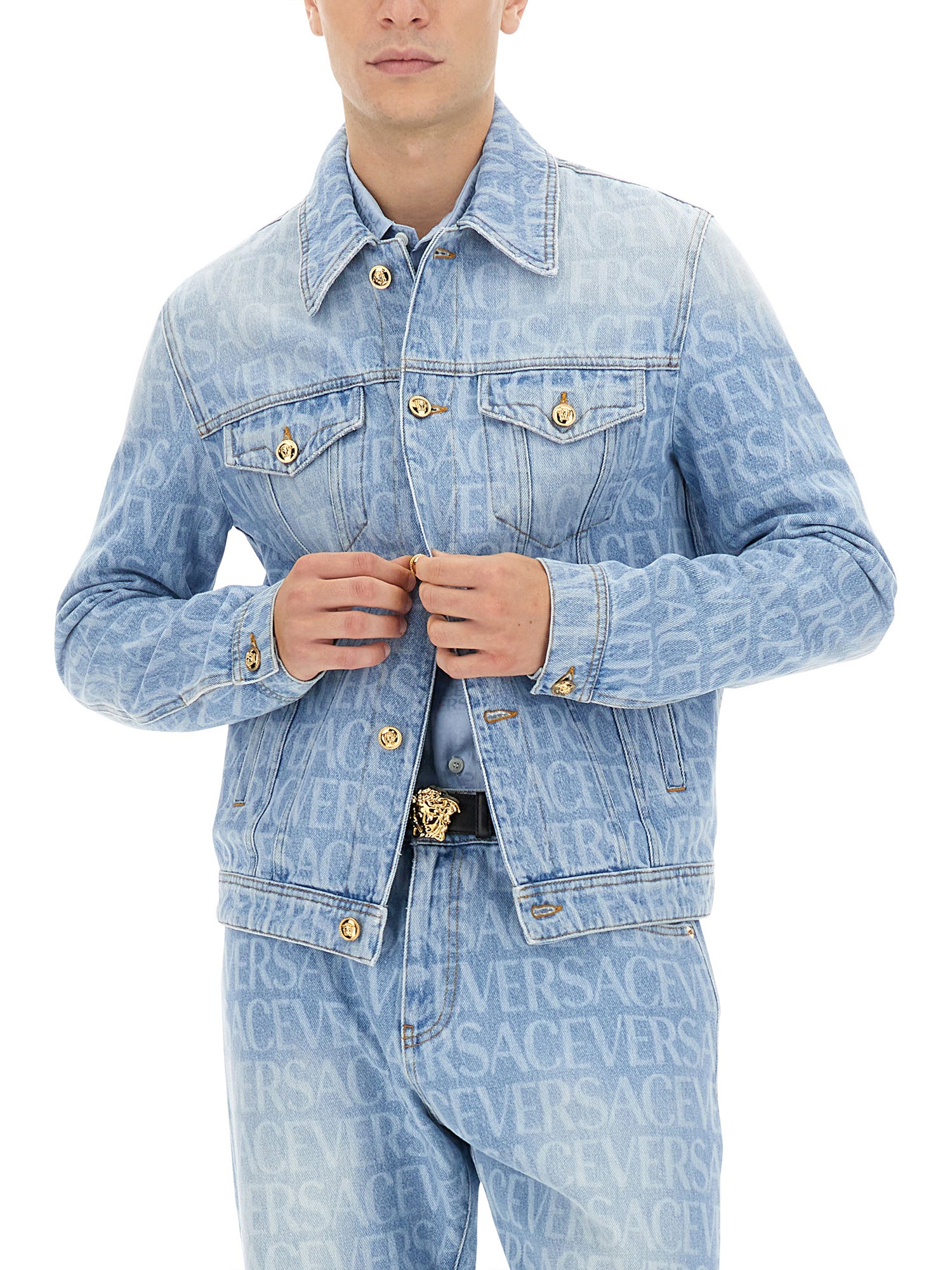 La giacca di jeans di Versace è un capo classico per ogni guardaroba. Questa giacca in denim è realizzata in un materiale resistente che vi terrà freschi d'estate e caldi d'inverno. La stampa del logo all-over è l'aggiunta perfetta a qualsiasi outfit. La stampa logo all-over con chiusura frontale a bottoni è un design elegante e accattivante che rende questa giacca perfetta per ogni occasione.