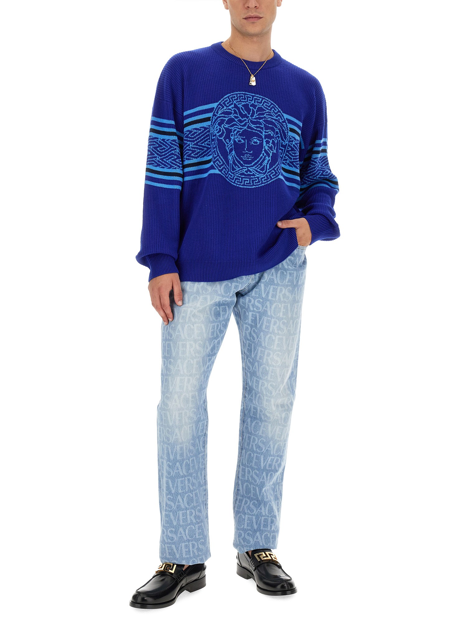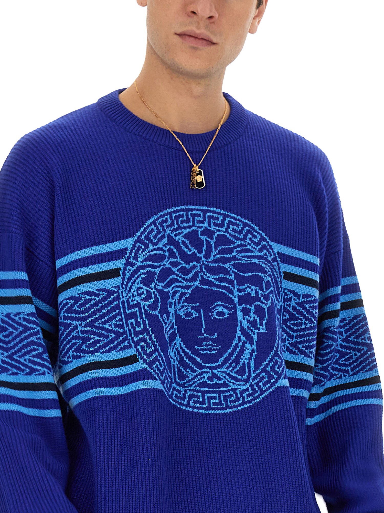 Un classico capo da lavoro di Versace con un tocco di lusso. La stampa del logo Medusa sul davanti di questa morbidissima felpa in jersey di lana vergine vi terrà sicuramente al caldo. La felpa in jersey di lana vergine con logo Medusa è un capo essenziale per ogni guardaroba. Con una vestibilità moderna, la stampa del logo Medusa sul davanti, i polsini e l'orlo a costine, è perfetta per essere indossata a strati o vestita in modo elegante.