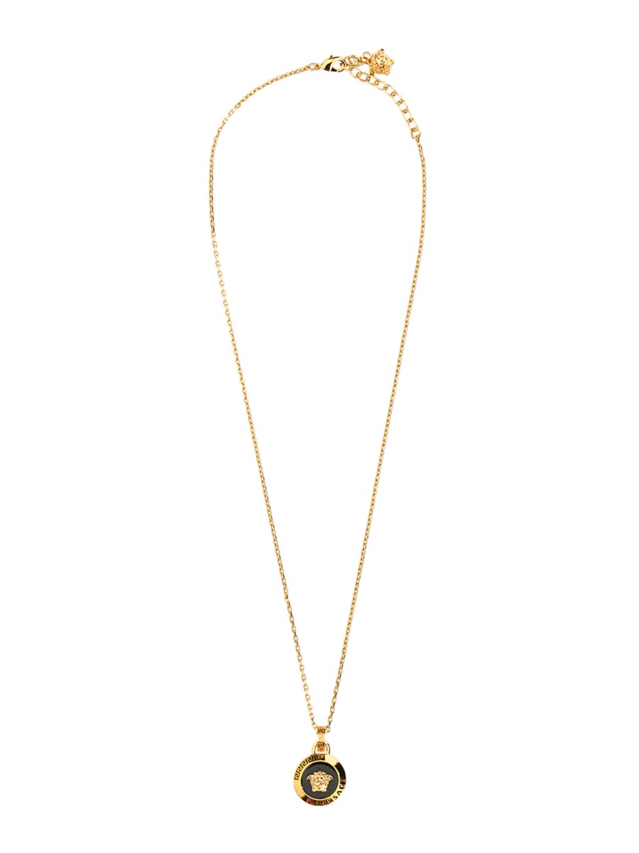La collana con pendente a moschettone "Medusa" di Versace è un gioiello unico e di classe. Presenta una medusa in ottone con una delicata catena in ottone. La collana può essere indossata a qualsiasi lunghezza e il ciondolo ha una finitura liscia e lucida.