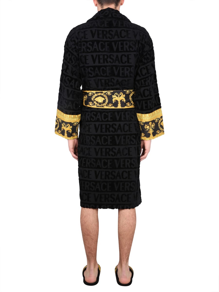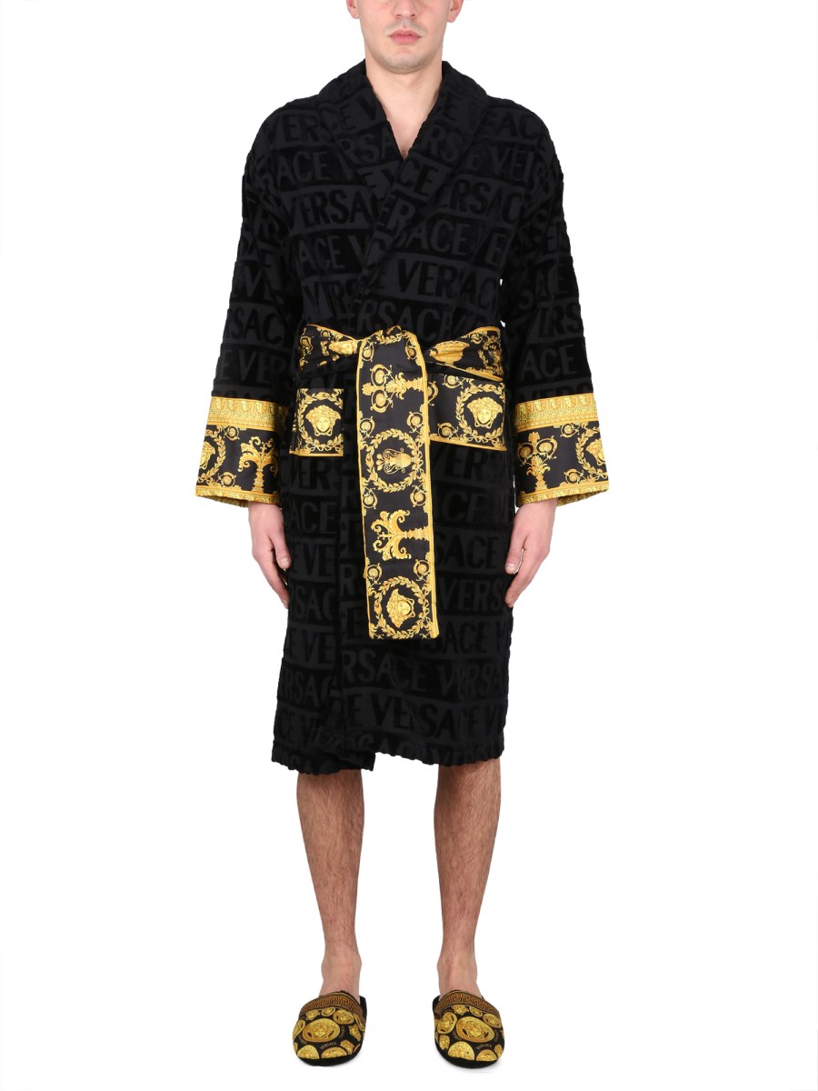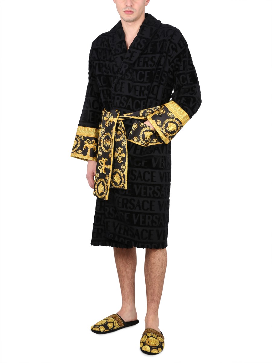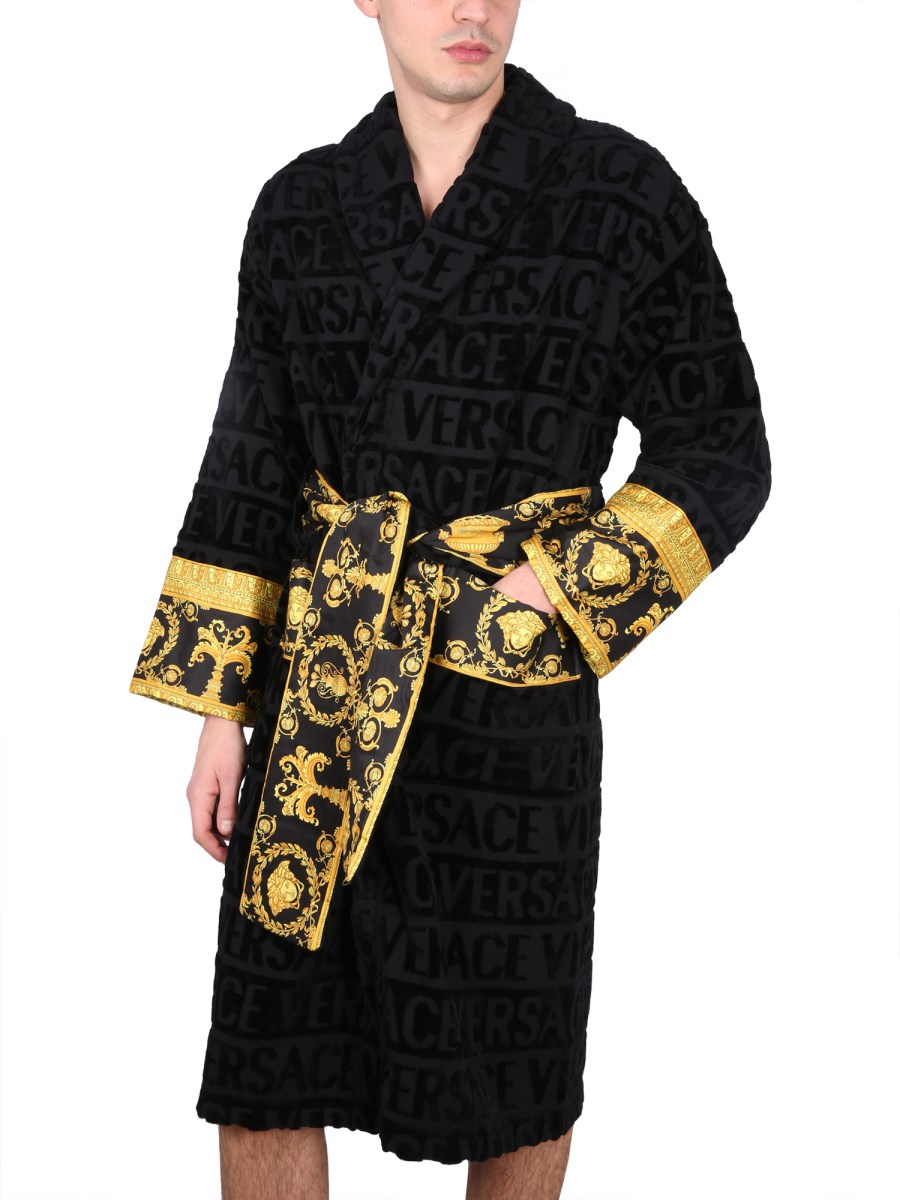 - COLLO SCIALLATO- MOTIVO CON TEXTURE LOGO- MANICHE E CINTURA CON STAMPA BAROCCO- TESSUTO ESTERNO: 100% COTONE- FINITURE: 100% COTONE - MADE IN ITALY