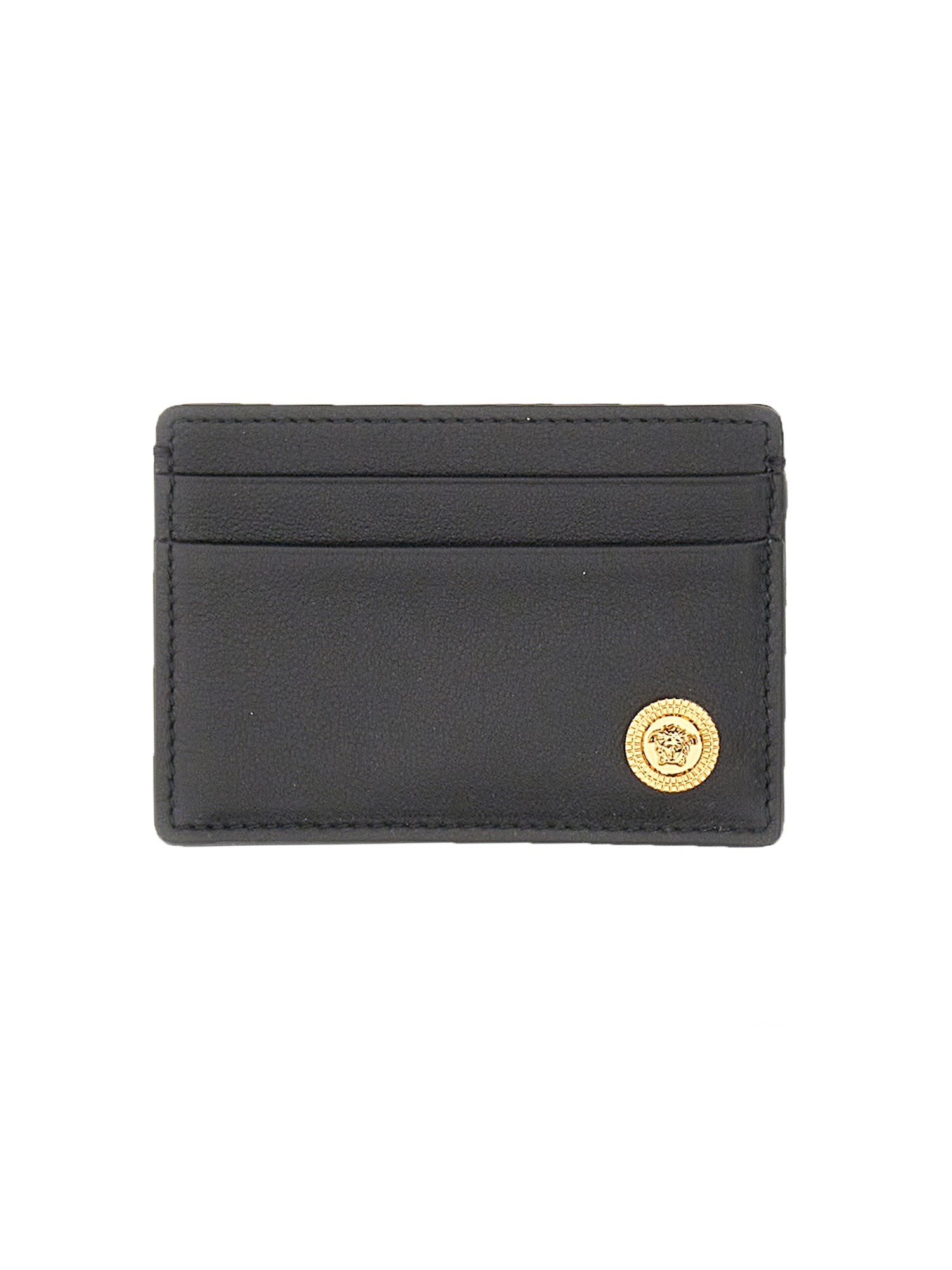 Il portacarte in pelle di vitello con dettaglio del logo Medusa di Versace è un prodotto molto utile e utile per tutti coloro che amano tenere in ordine le proprie carte. La pelle di vitello è morbida ed elastica, il che lo rende facile da tenere e da usare. Presenta una tasca centrale, quattro scomparti per carte e il dettaglio del logo.