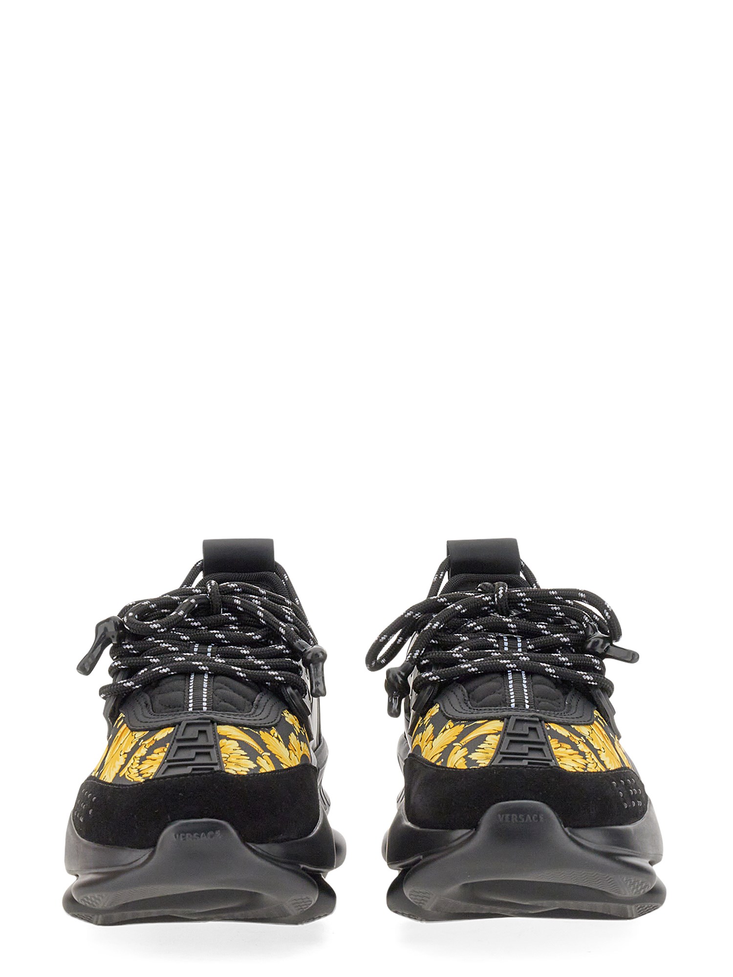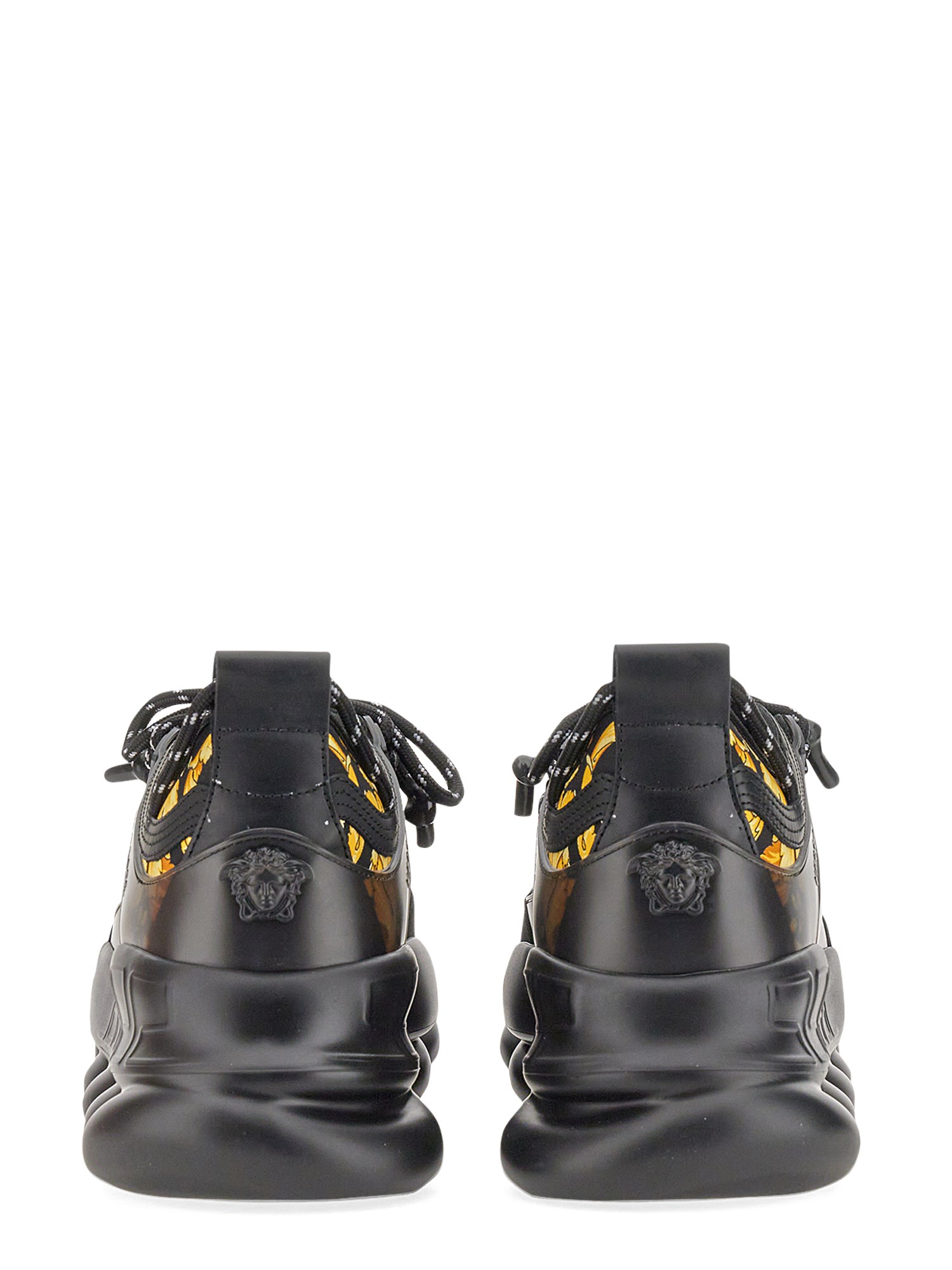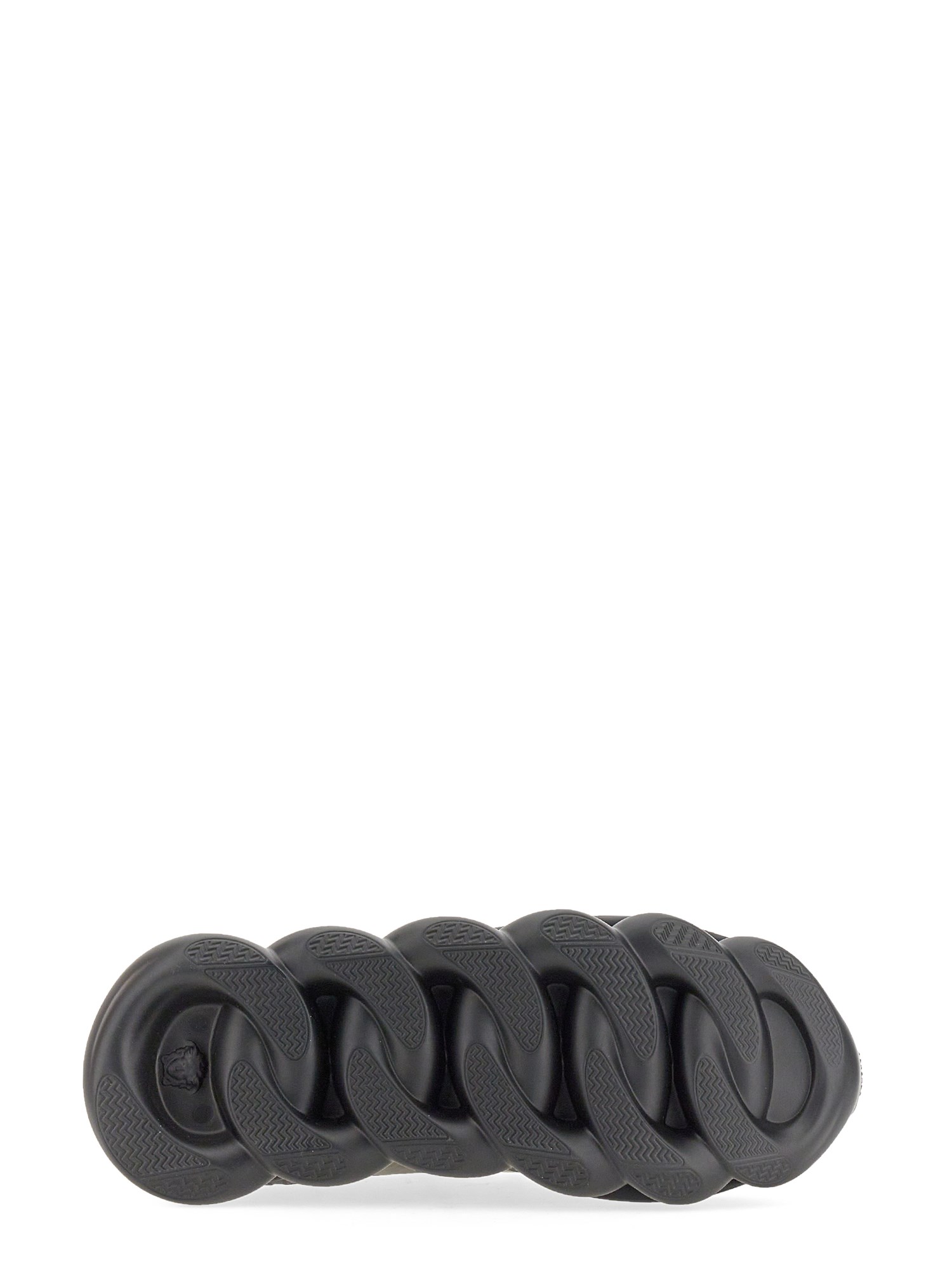 Queste scarpe Chain Reaction Leather di Versace = sono perfette per chi cerca una scarpa moderna e di tendenza con un design pratico. Il fondo in gomma di queste scarpe è antiscivolo e protegge i piedi da scivolate e cadute. Sono inoltre dotate di una parte anteriore chiusa per tenere i piedi al caldo.