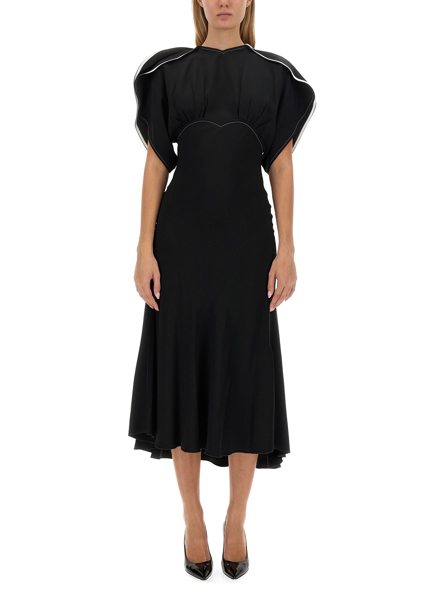 Questo abito midi fit-and-flare ha maniche drappeggiate per una silhouette audace. Il corpetto è dotato di una leggera arricciatura sul busto per un tocco di femminilità, mentre le cuciture a contrasto aggiungono una punteggiatura contemporanea.