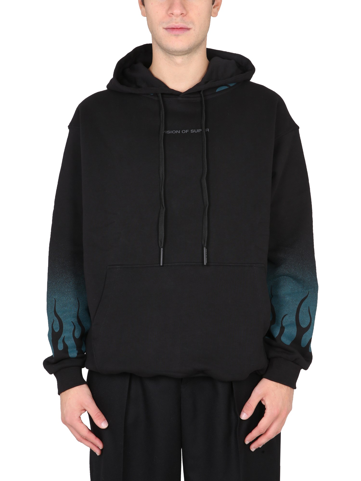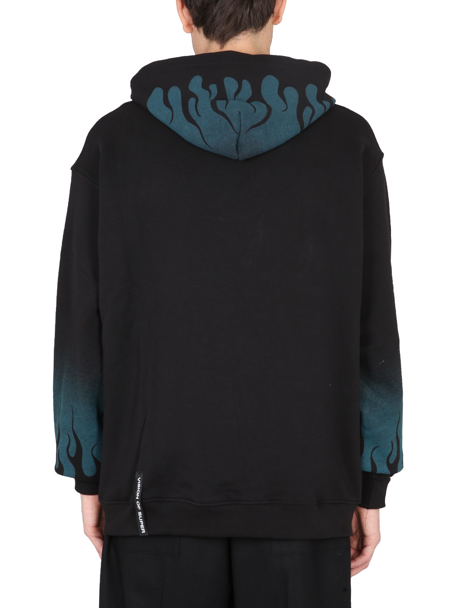 Indossate l'elegante e calda felpa con cappuccio in cotone "Negative Flames" di Vision of Super. Comoda e traspirante, è perfetta per ogni stagione. Ha un cappuccio con coulisse, maniche lunghe, una tasca frontale a marsupio e un motivo a fiamme stampato su maniche e cappuccio.