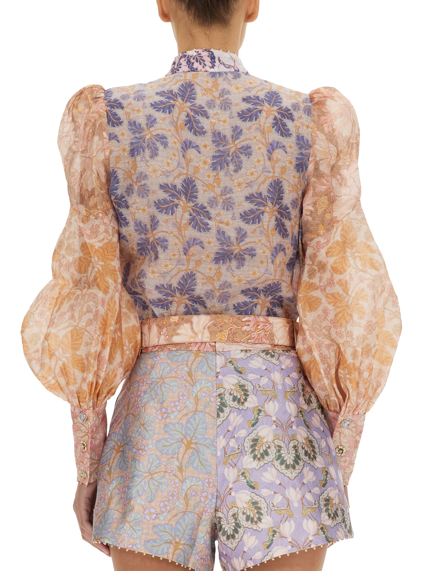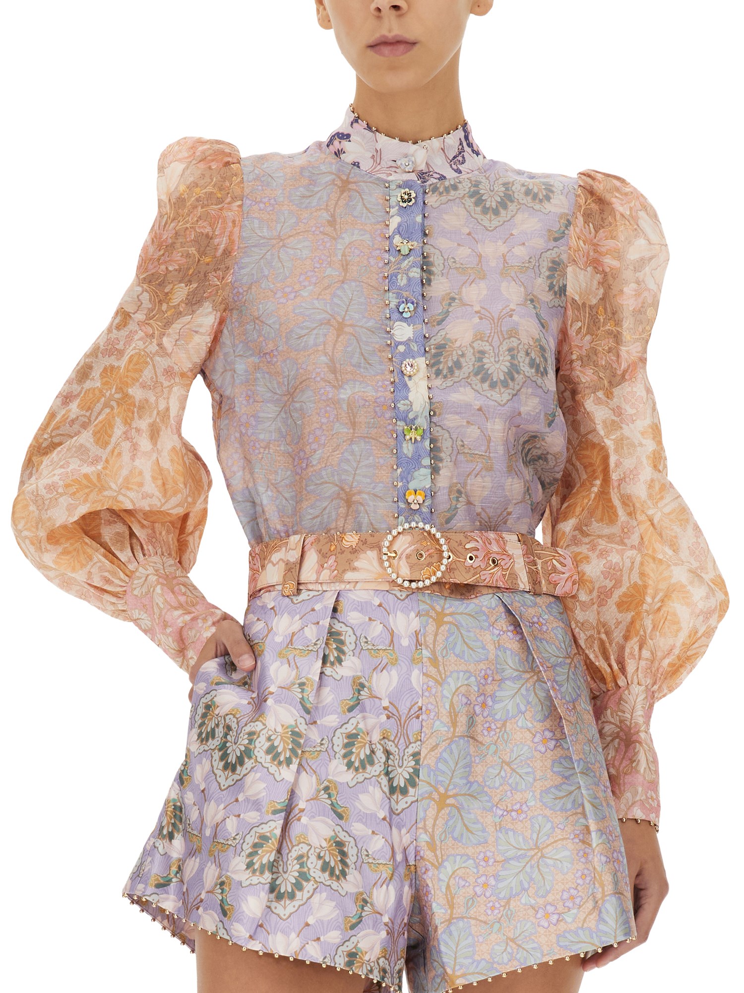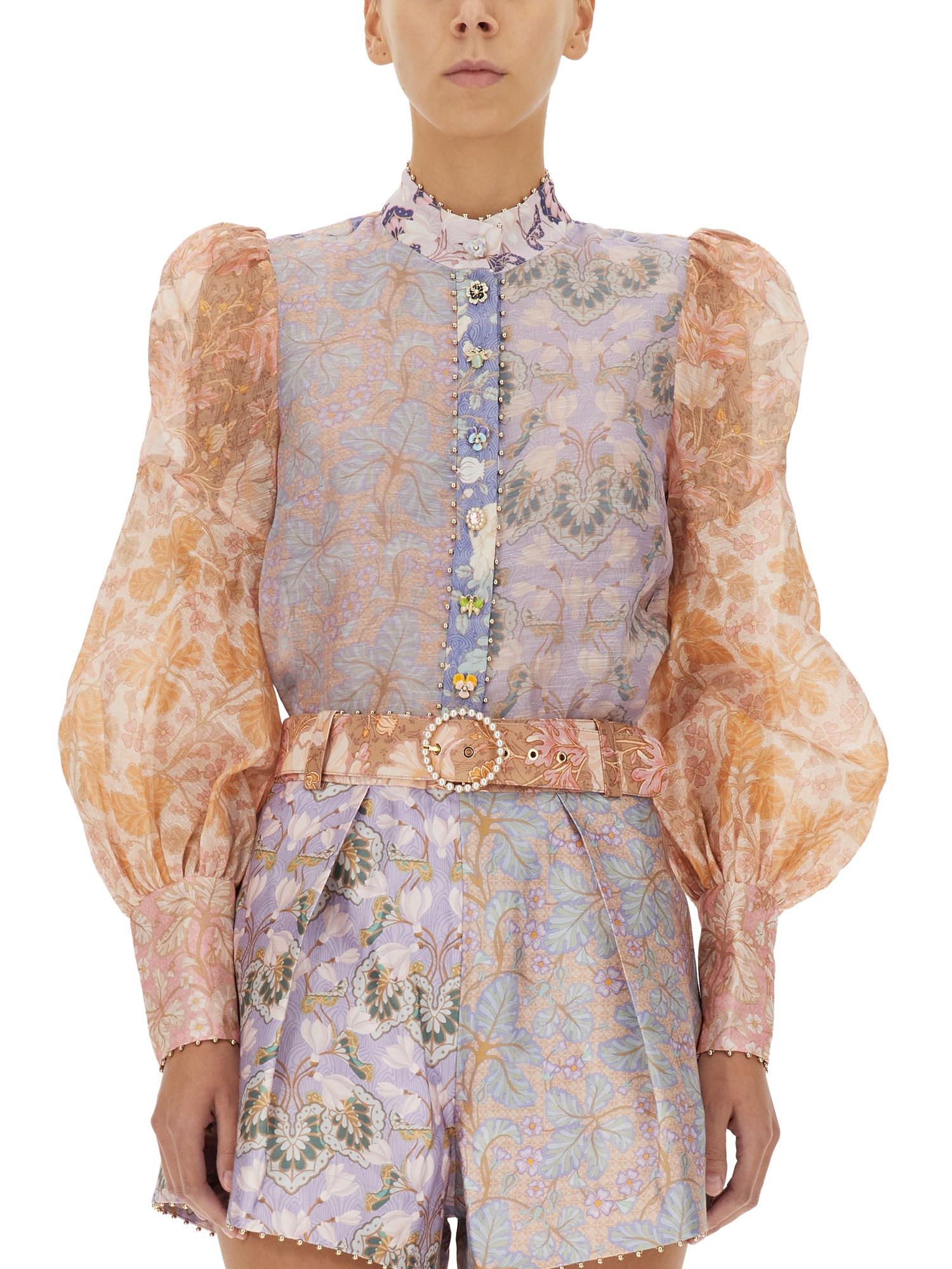 La camicia in lino e seta di Zimmerman è una camicia classica e di classe con un tocco di eleganza. La camicia è realizzata in lino e seta, quindi è resistente, morbida e traspirante. Questa camicia è realizzata con i due materiali in perfetta armonia e ha un aspetto leggero e arioso. Presenta un colletto alla mandarina, chiusura frontale con bottoni e maniche a palloncino che esalteranno il vostro lato femminile.