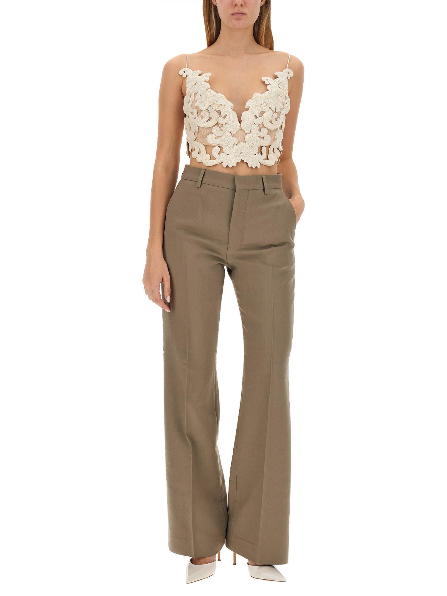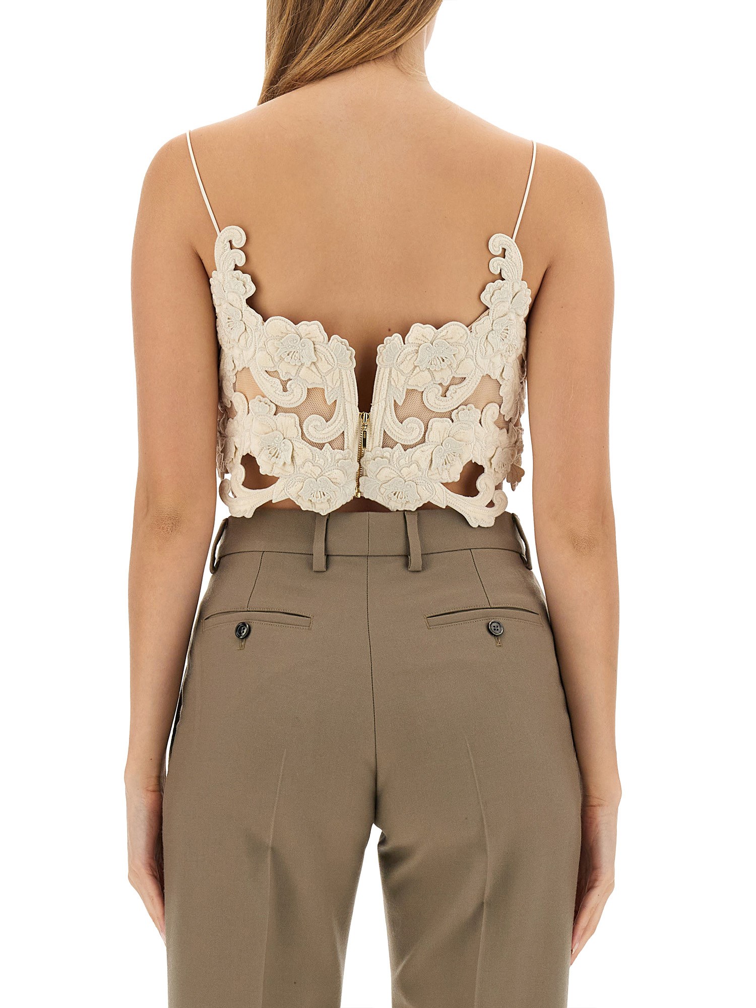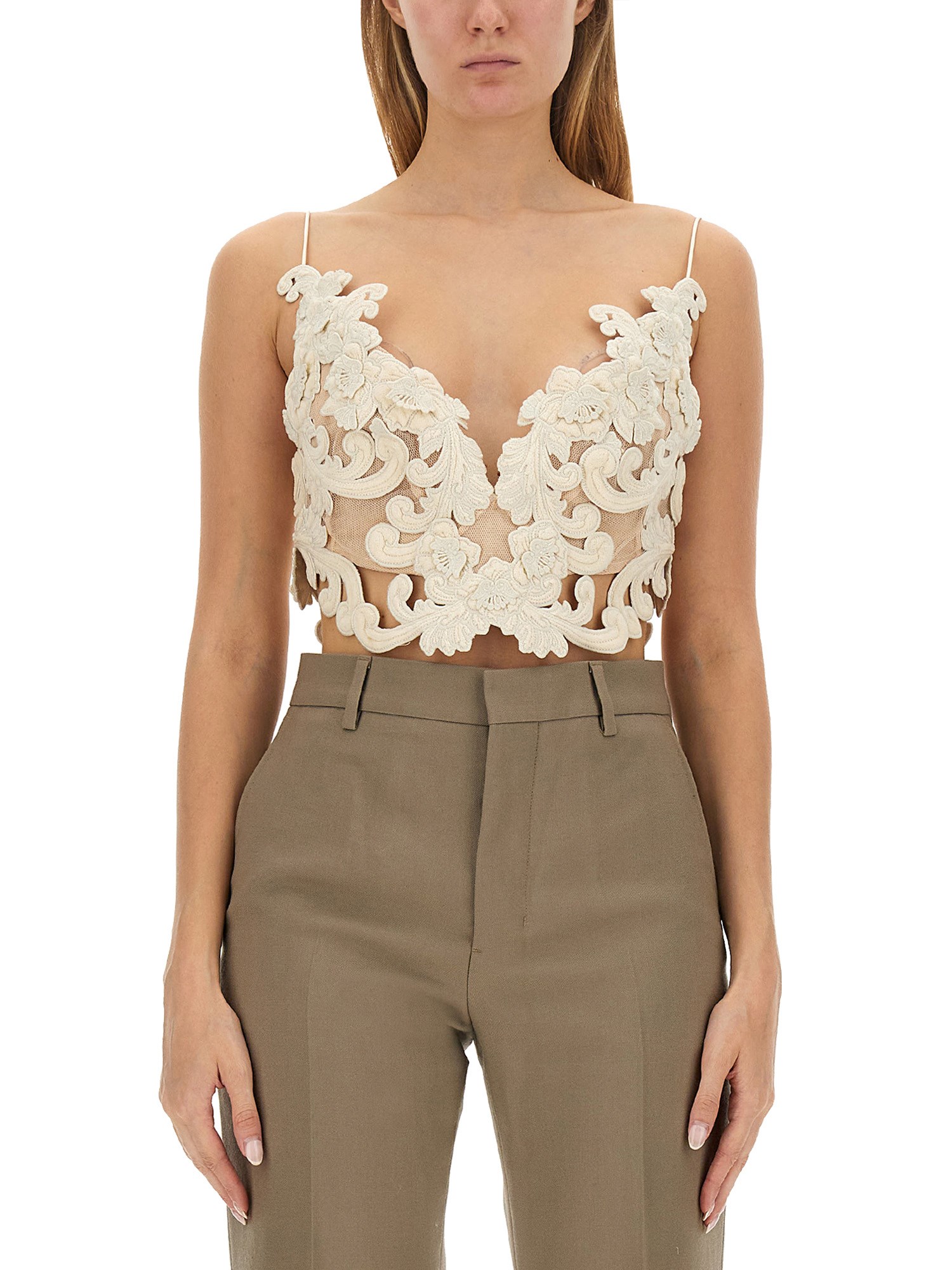 Il Sensory Velvet Lace Bodice in Macadamia della collezione Autunno 2023, Luminosity, è un seducente corpetto cropped. Sfoggia intricati motivi di ricamo in velluto, con spalline rouleau fisse e una profonda scollatura per un look elegante. La zip a vista e la fodera aggiungono stile e comfort a questo capo accattivante.