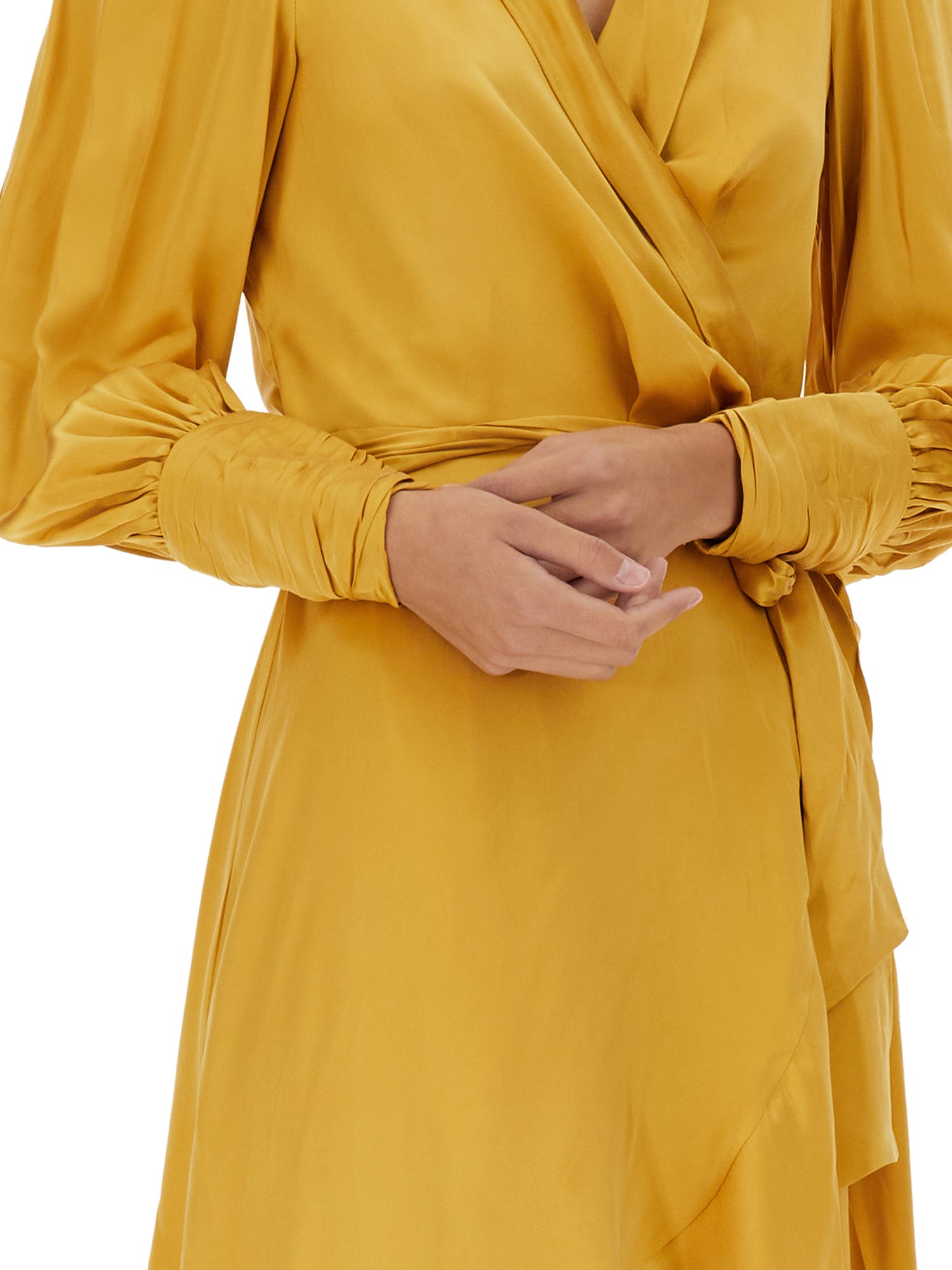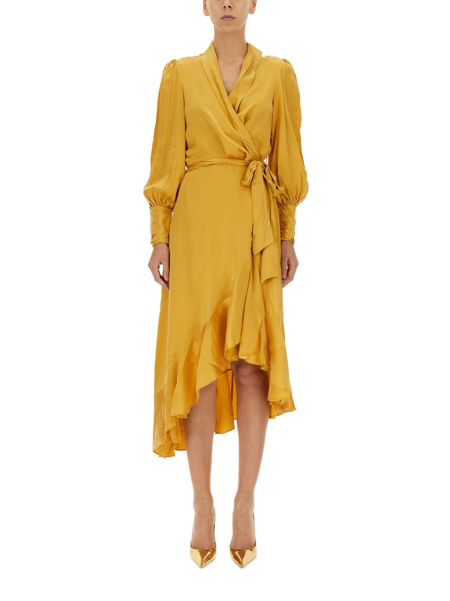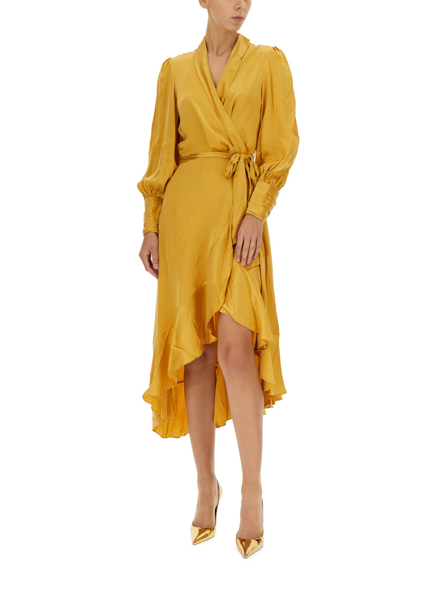 Questo abito in seta della maison Zimmermann è caratterizzato da un materiale velato e delicato, con una chiusura avvolgente dal design strutturato, una gonna midi asimmetrica, maniche blouson e una cerniera invisibile sui polsini. L'abito è anche incredibilmente morbido, il che lo rende comodo da indossare. È perfetto per una serata con le ragazze, una festa o un evento elegante.
