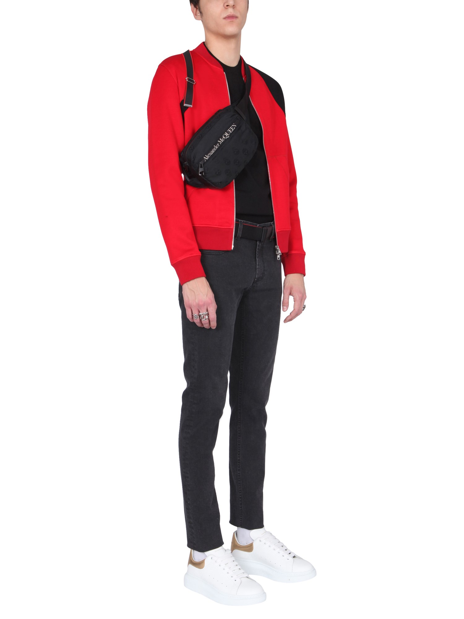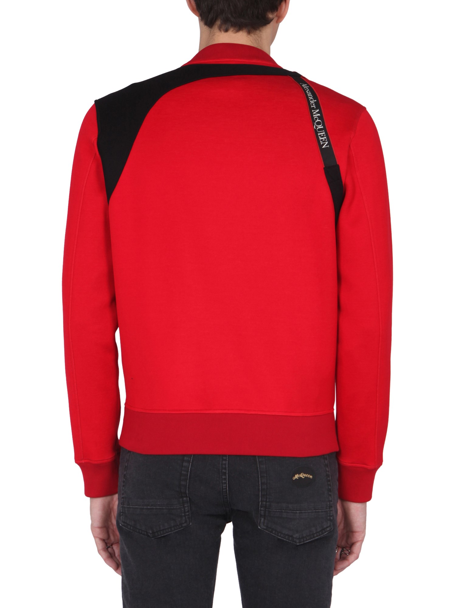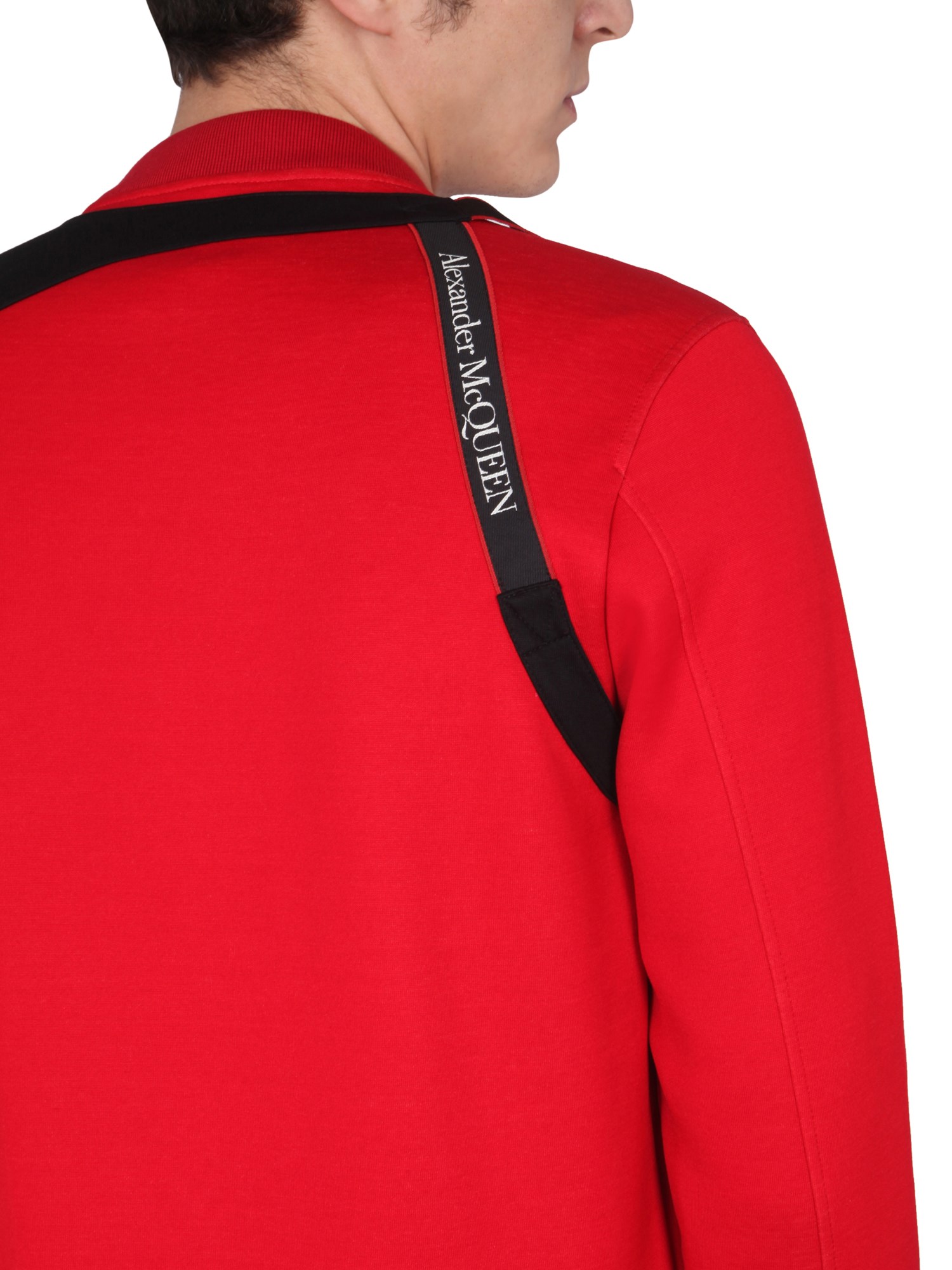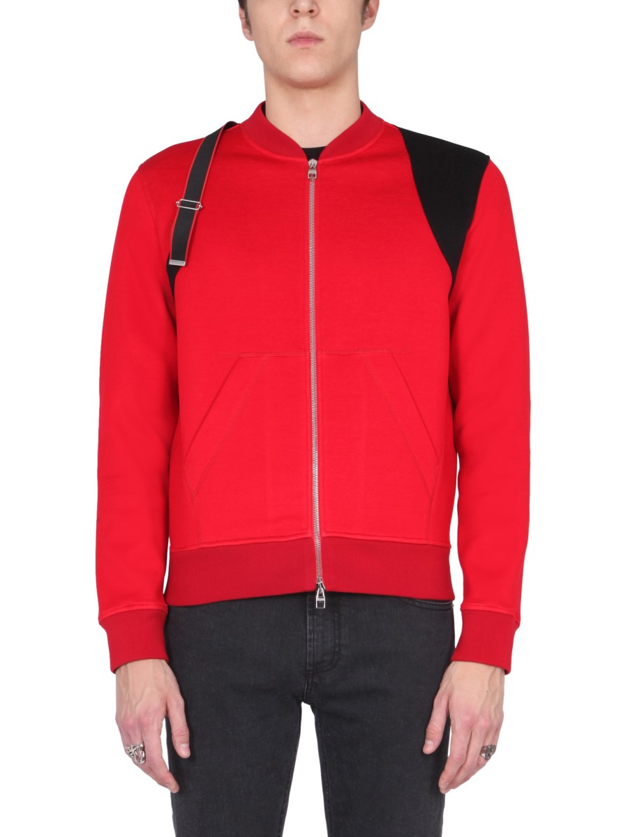 Stand out in the crowd with this Bomber with Harness Strap by Alexander McQueen. The bomber has a ribbed neckline, cuffs and, bottom. Moreover, there is contrasting detail along the shoulder and the harness belt makes his bomber way more interesting than average bombers. The bomber has a front zip closure and features two front kangaroo pockets as well. It is made up of 62% cotton and 38% polyamide.