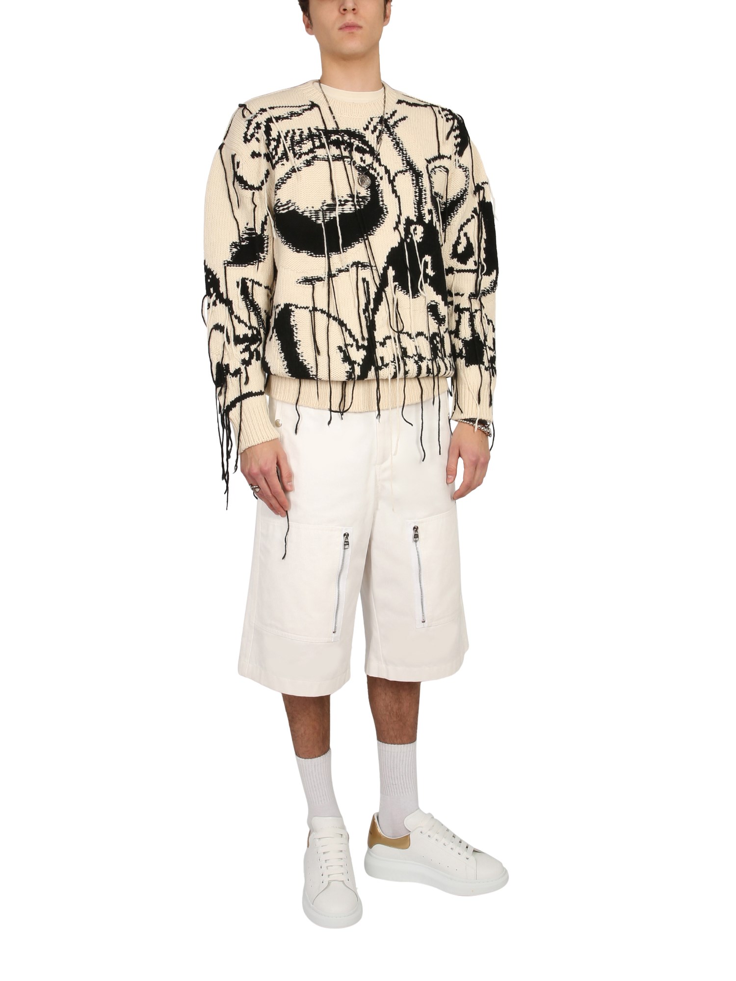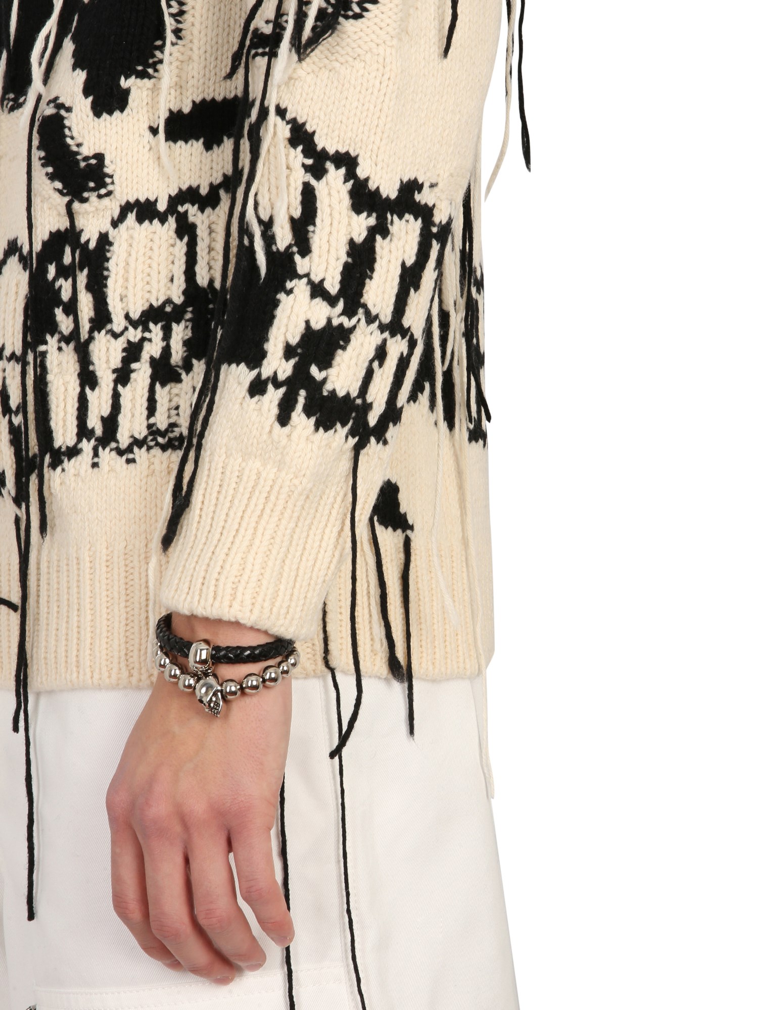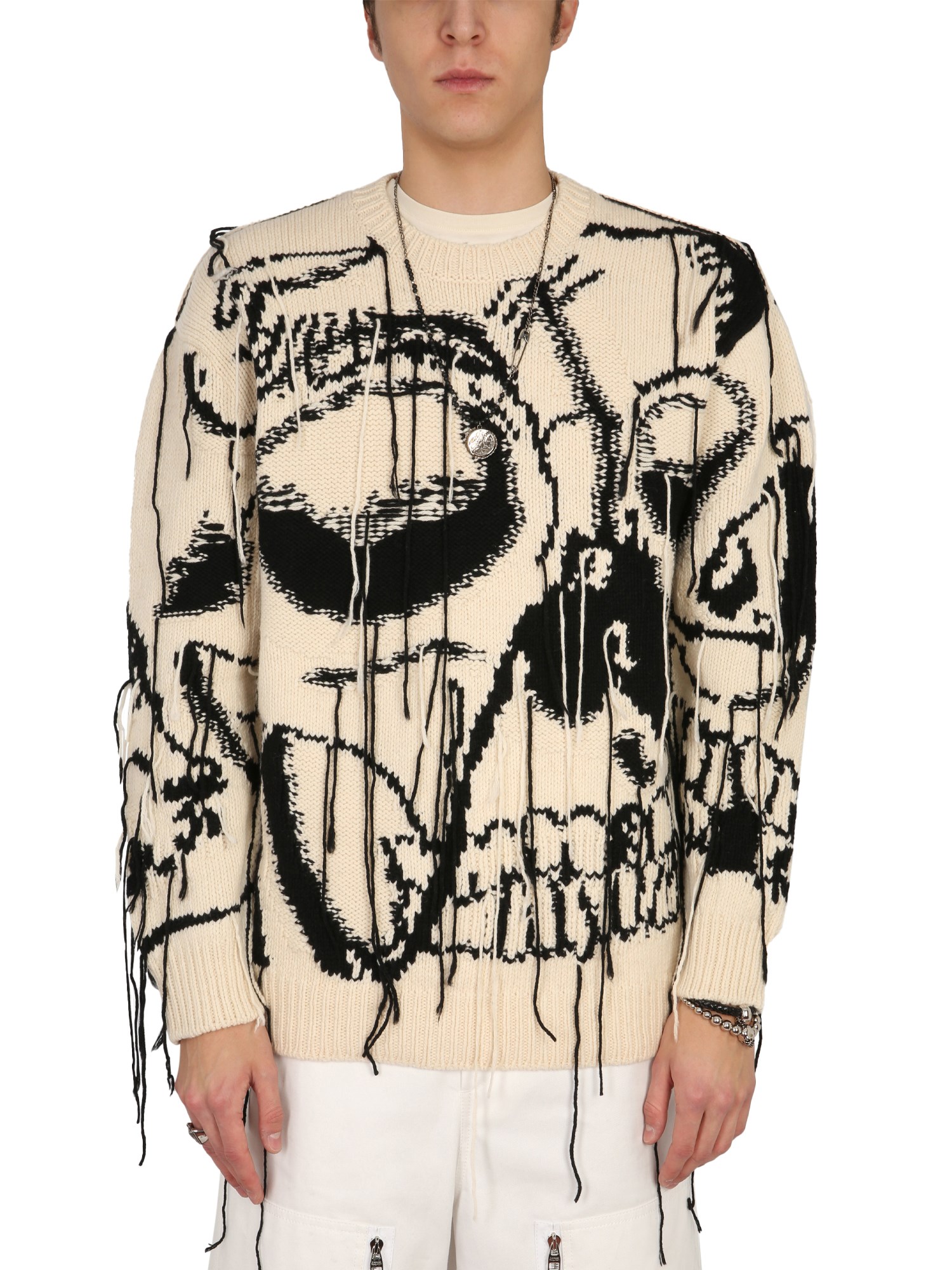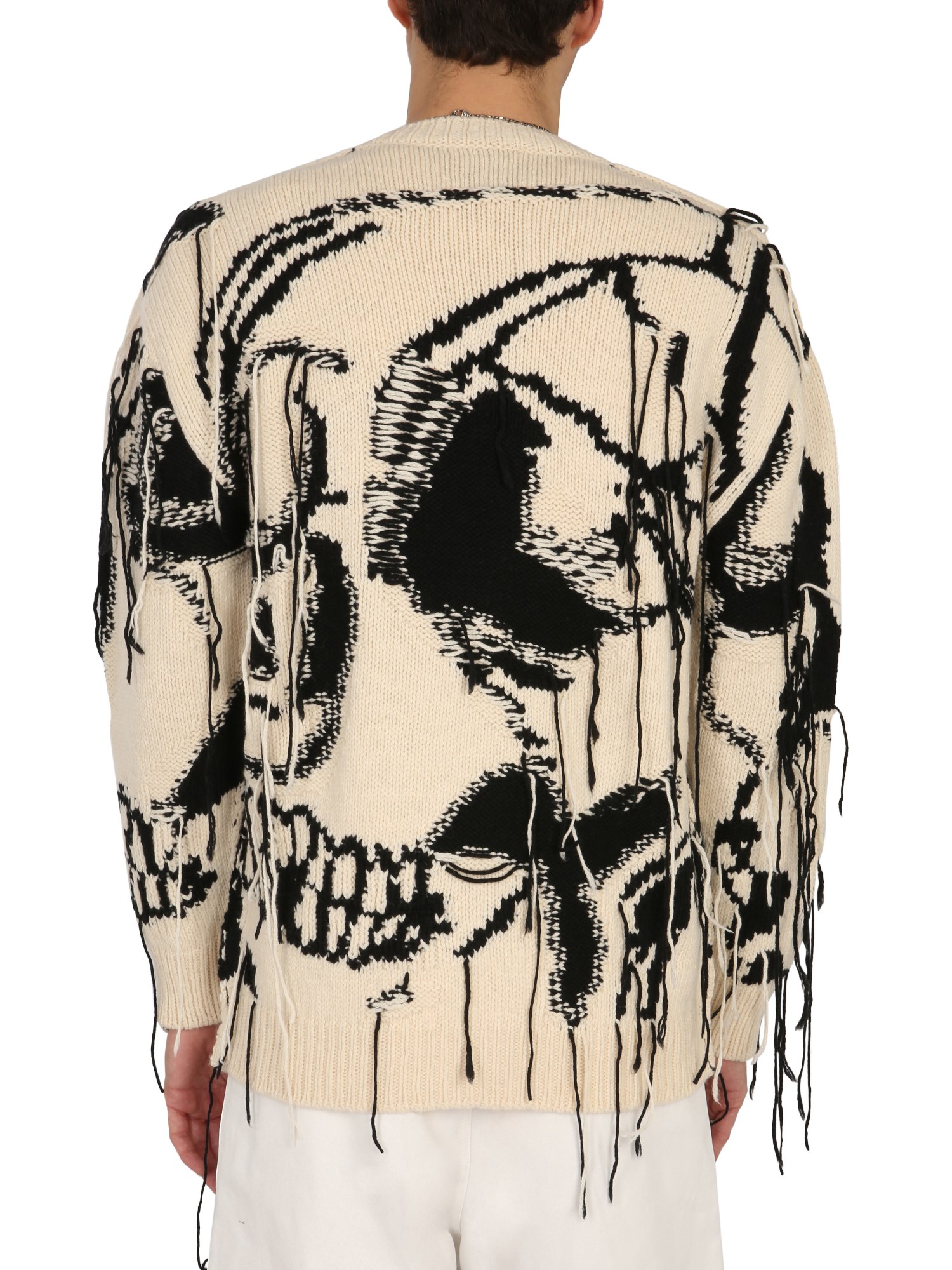 Stay warm without compromising with the style in this cashmere skull sweater designed by Alexander McQueen. A perfect blend of style and comfort, the sweater is made from elasticated wool. It keeps you cosy without feeling suffocating. The oversized fit with a crew neckline gives you a nice look. This sweater has a skull pattern with contrast inlays and can be paired with trousers or jeans.