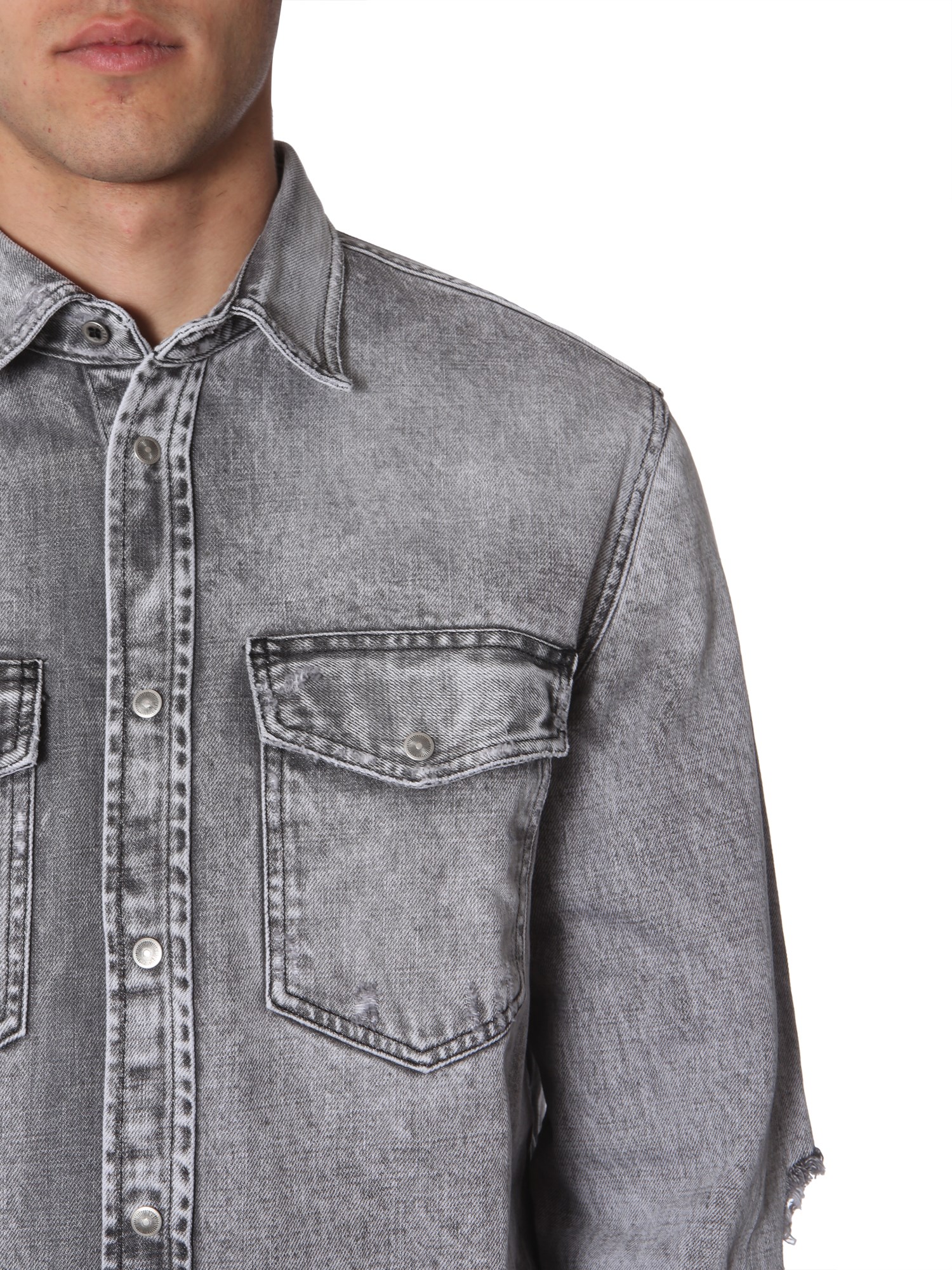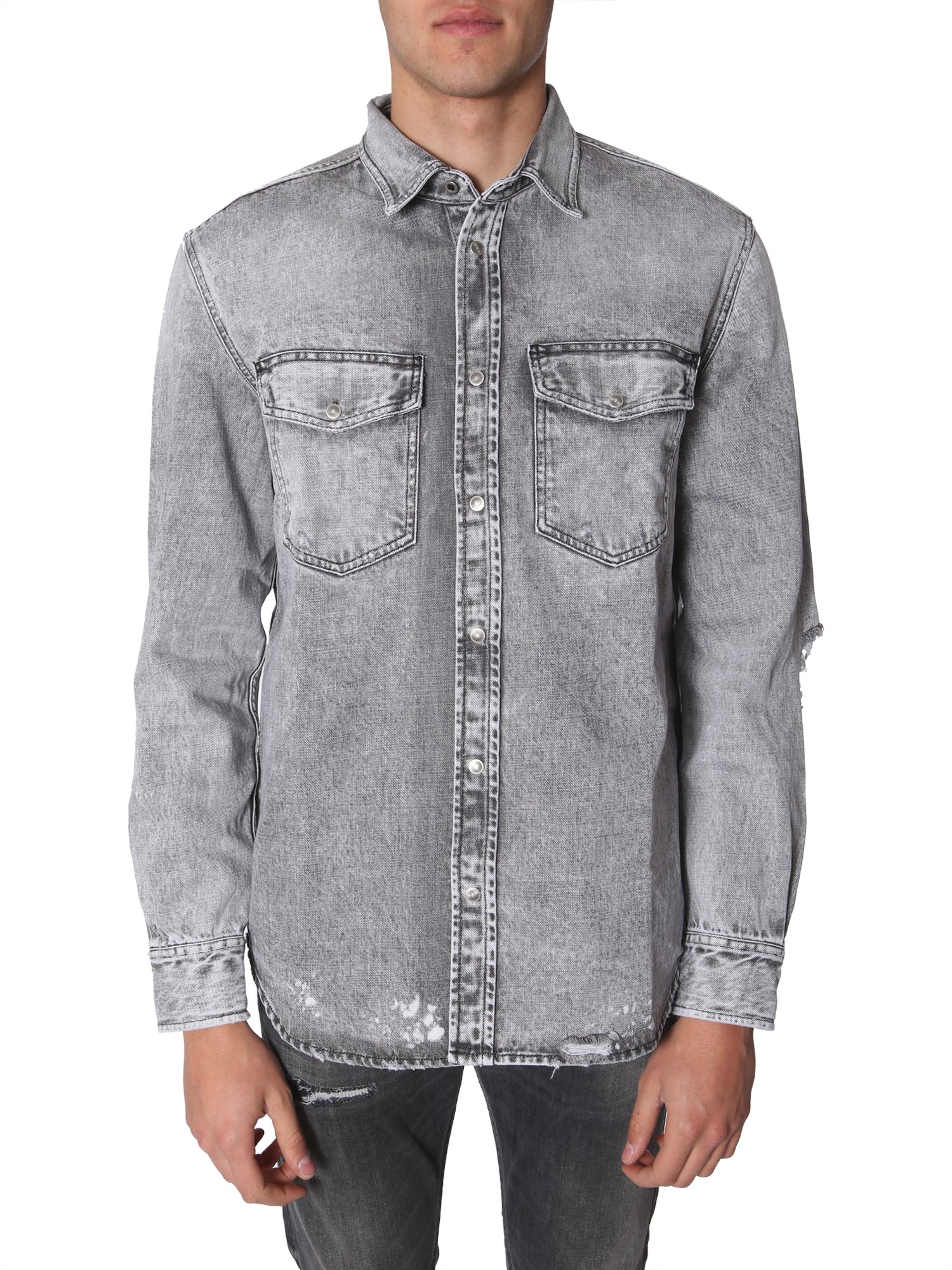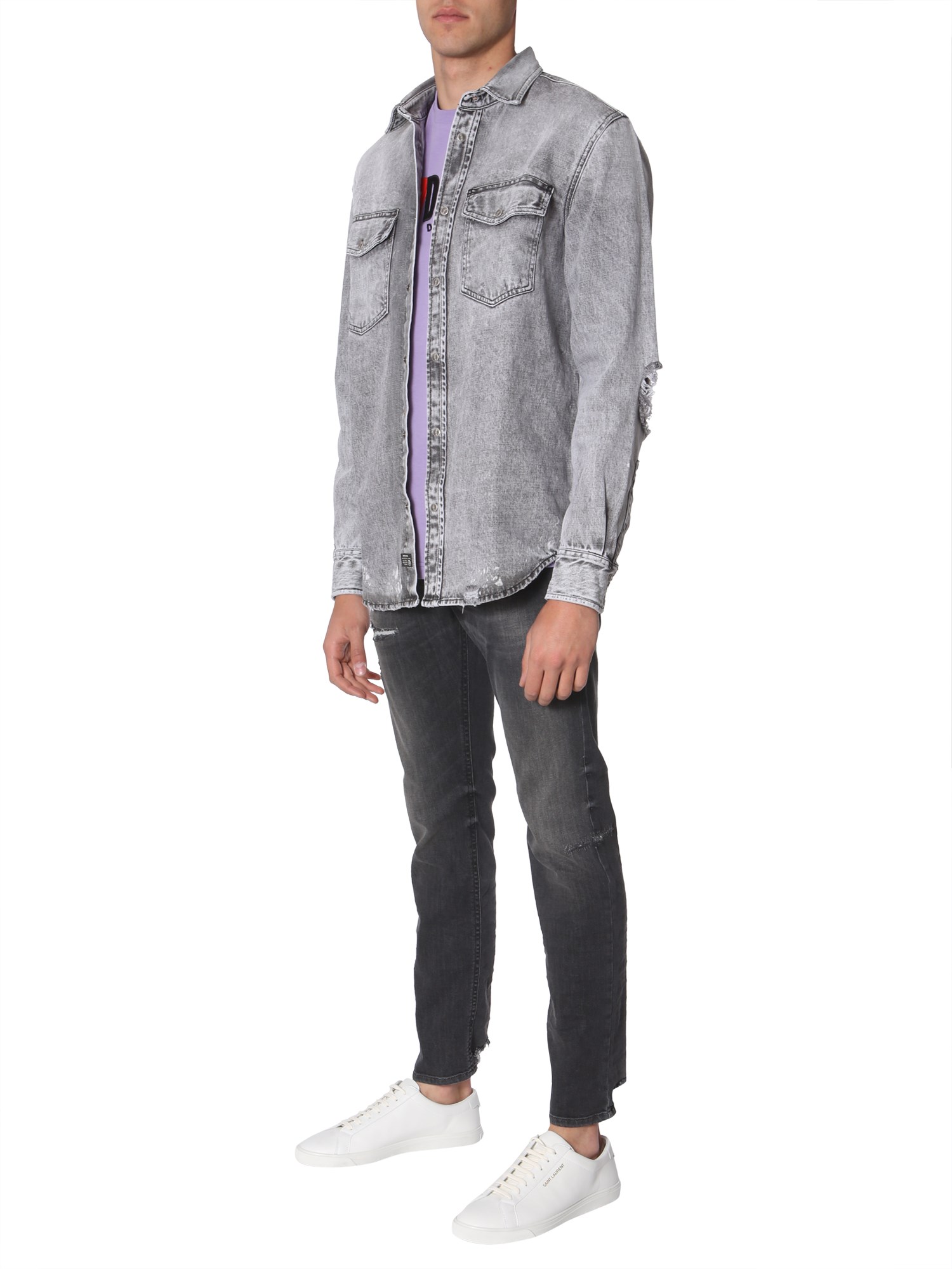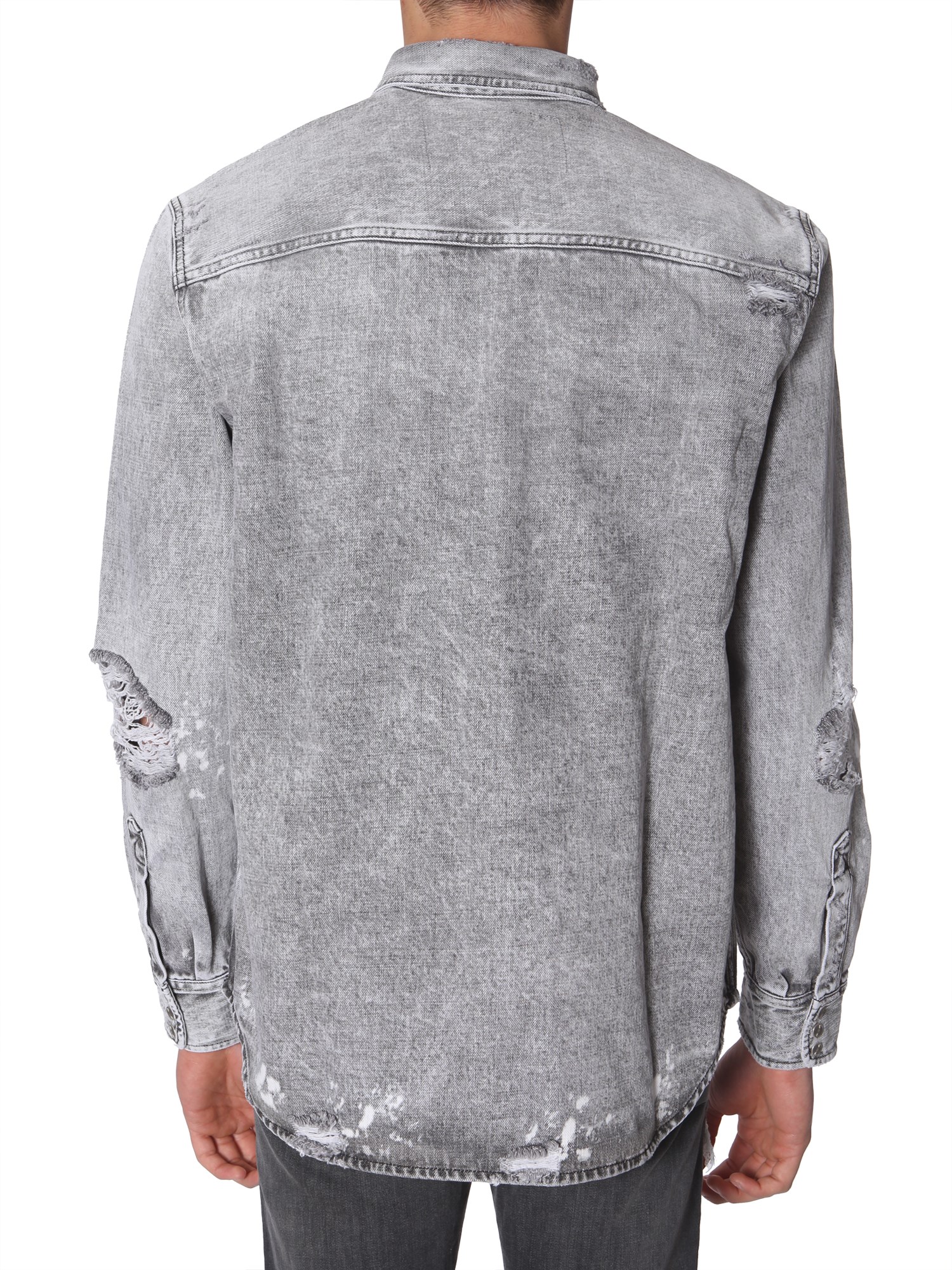 Look cool and feel young when you dress up casual with this "D-rooke-L" shirt from Diesel. The shirt is made using cotton and feels soft against your skin. The frayed details all over it make it stand out of the rest. Its classic collared neck and oversized fit make it ideal for summer time.