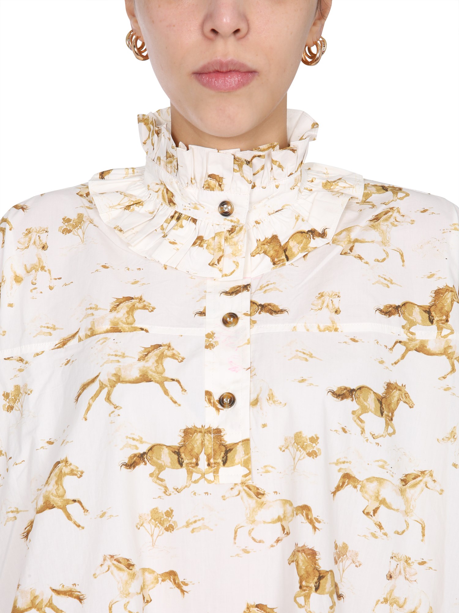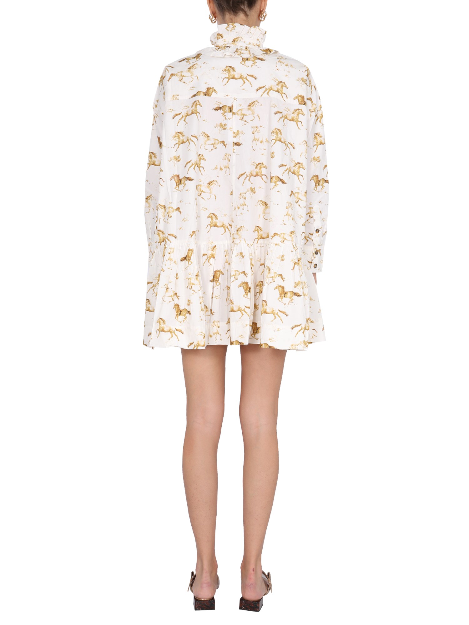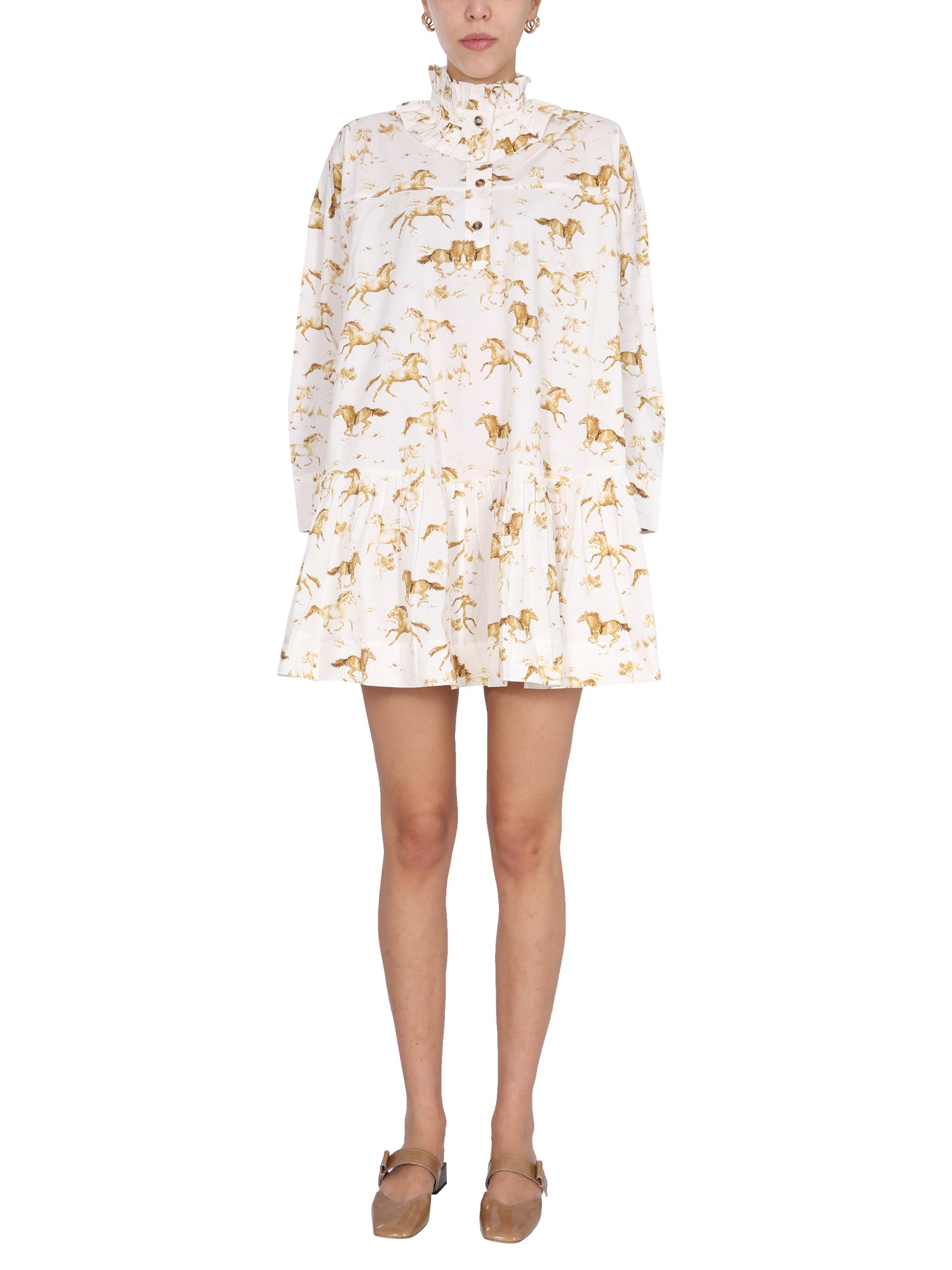 Look refreshing and vogue in this Oversize Fit Dress from Ganni. The dress is made purely from organic cotton making it extremely comfortable to wear and features a high neck with rouches. It has a front button closure and a jump on the bottom. The dress is covered with horse print all over it adding more style to it.