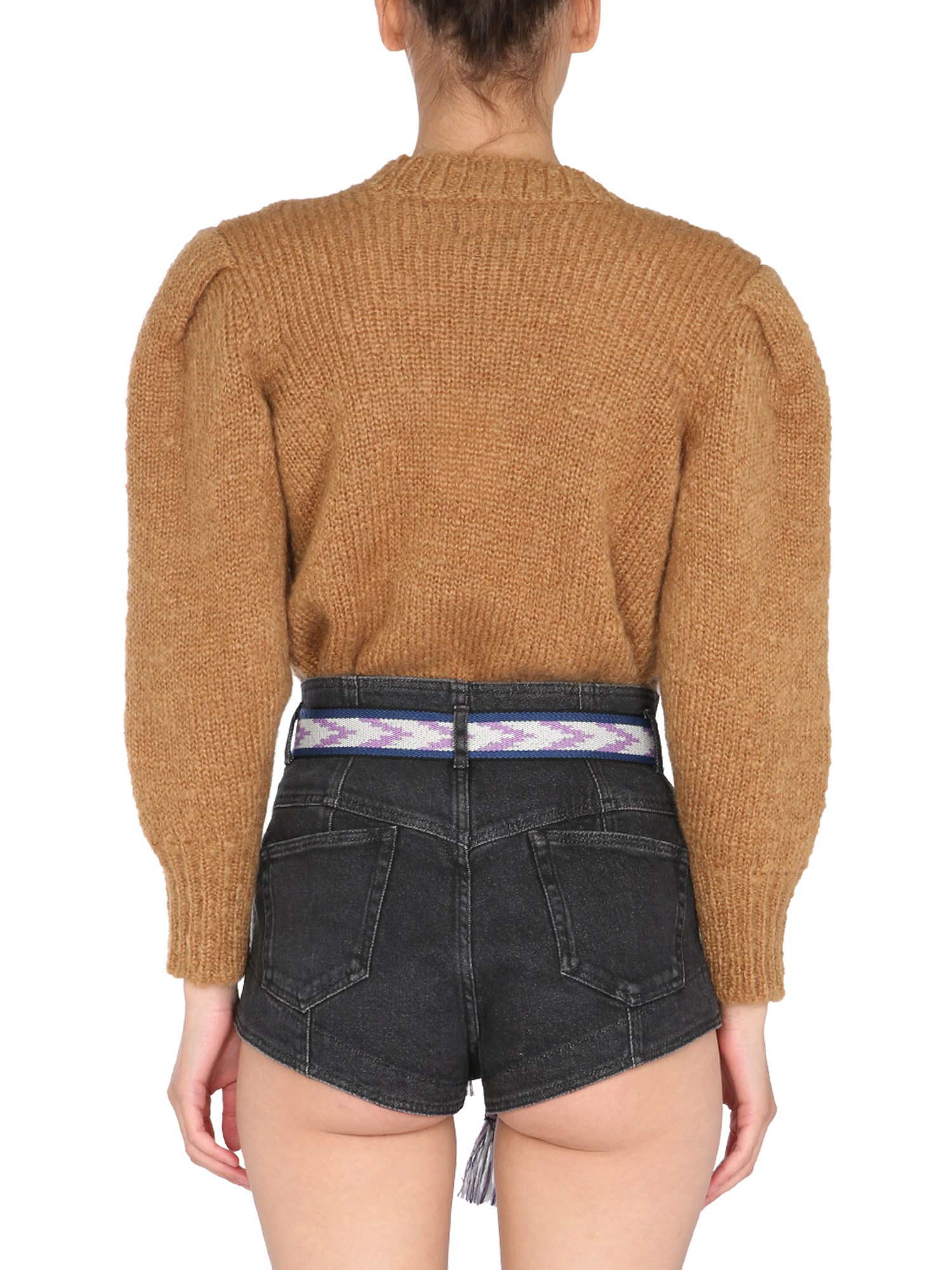 - GIROCOLLO- MANICA A SBUFFO- COLLO, POLSI E FONDO A COSTE- 81% MOHAIR, 11% POLIAMMIDE, 8% LANA MERINO- MADE IN ITALY- LA MODELLA È ALTA 180 CM E INDOSSA LA TAGLIA 36 FR