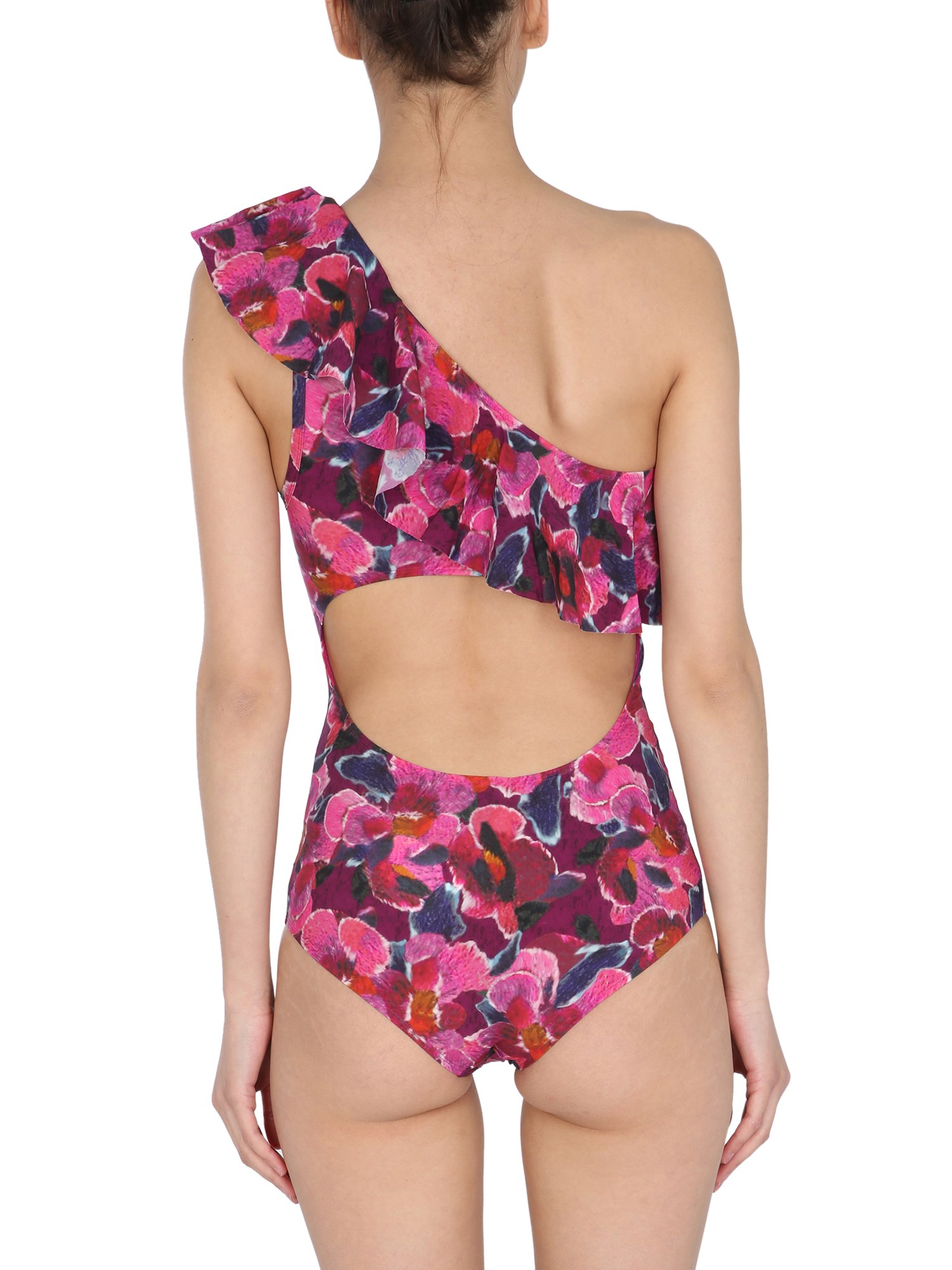 - MONOSPALLA- VOLANT ASIMMETRICI FRONTALI - STAMPA FLOREALE ALL OVER- 100% LYCRA - LA MODELLA É ALTA 180 CM E INDOSSA LA TAGLIA 36 FR