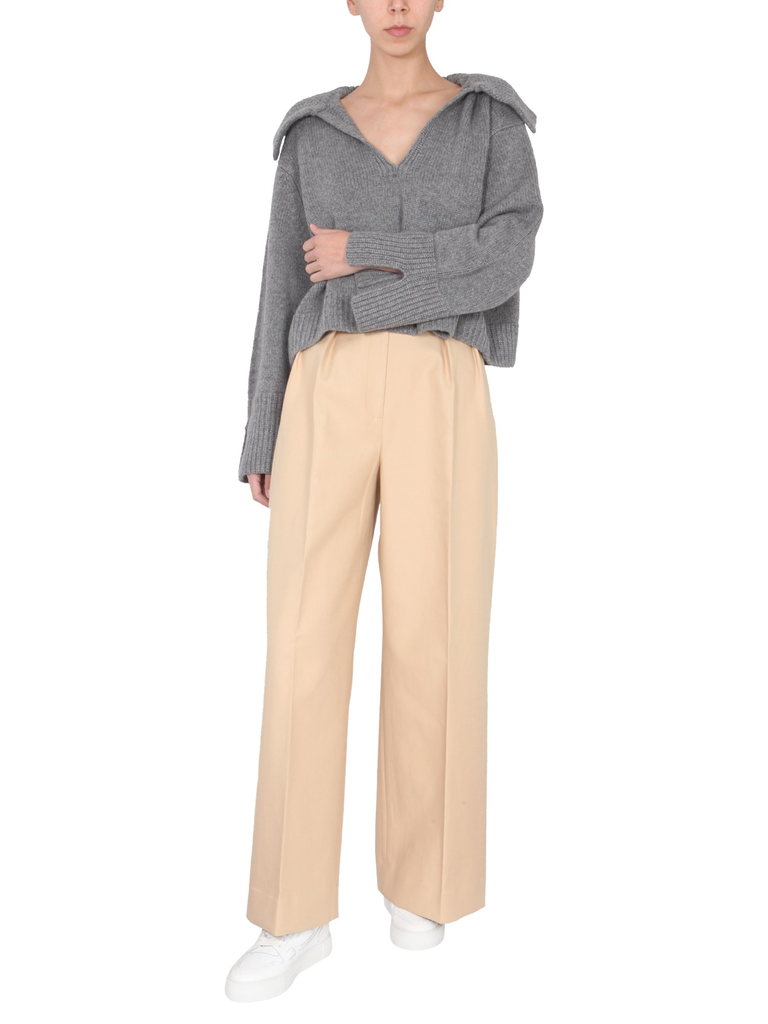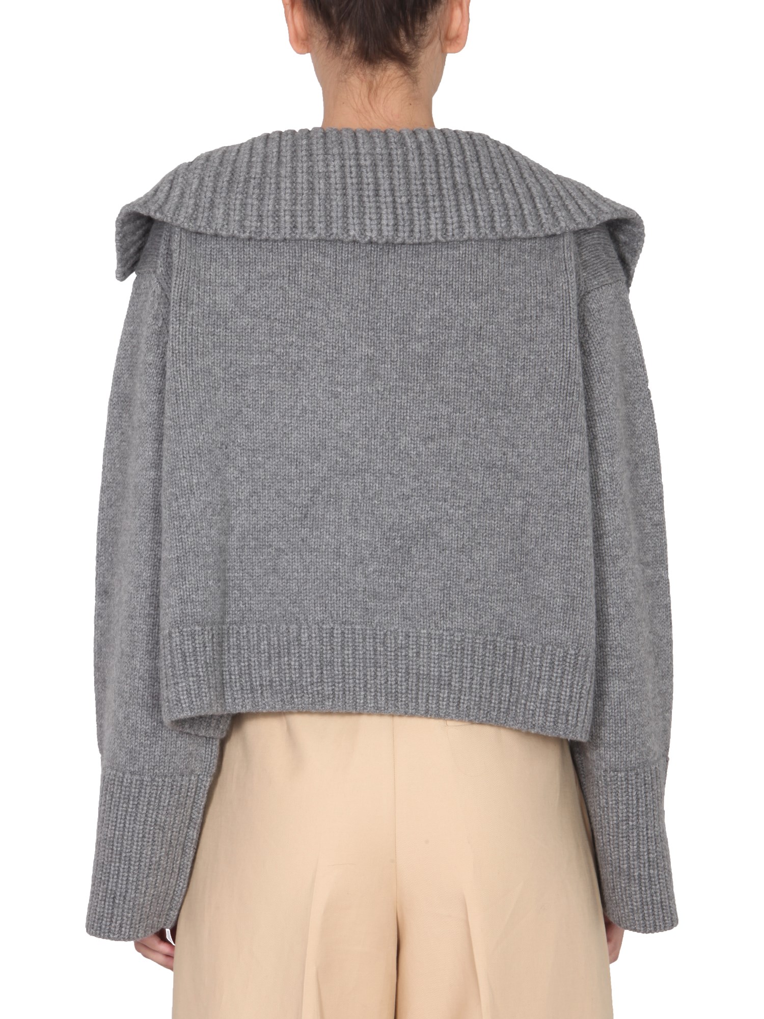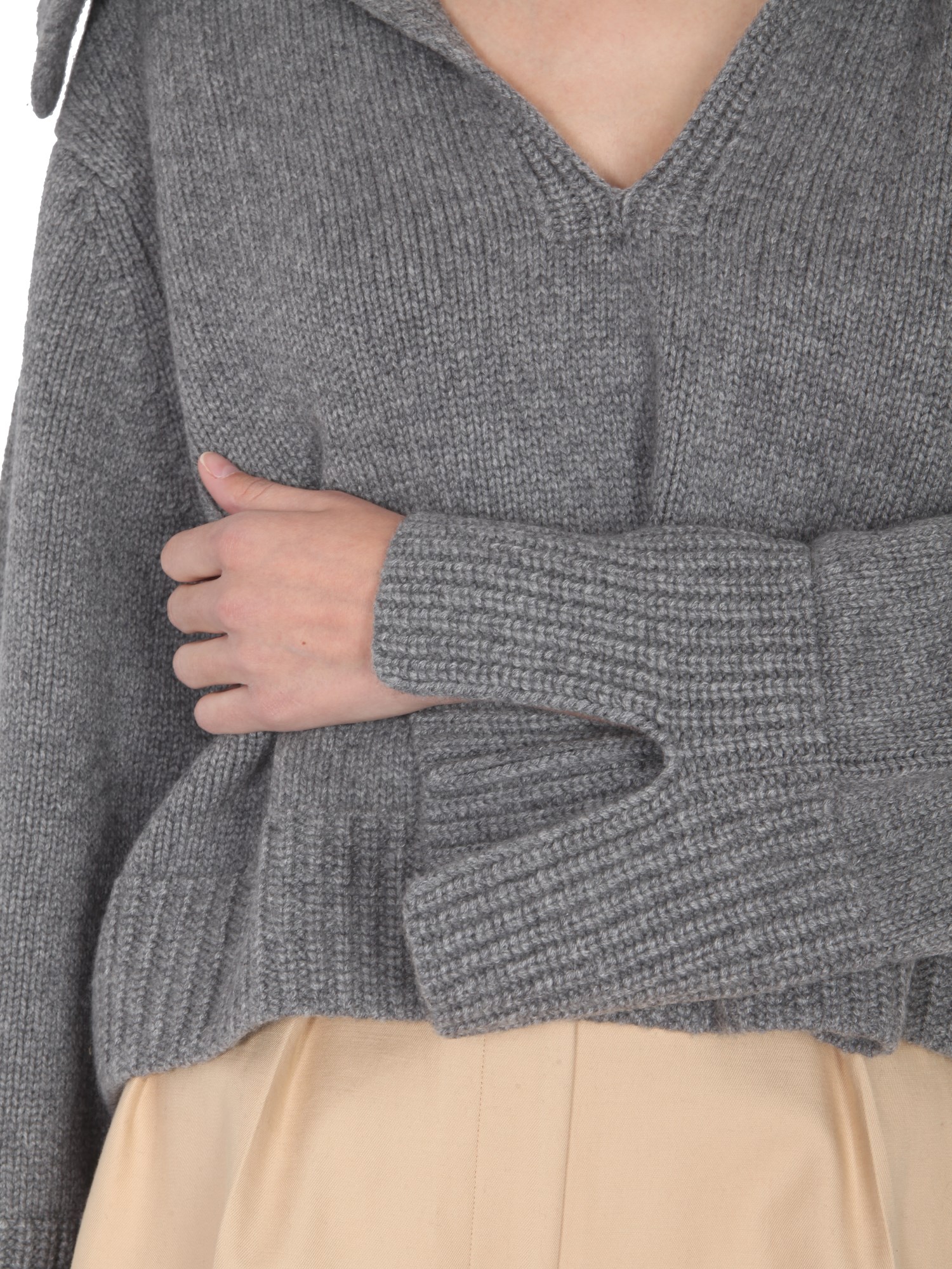 - SCALE COLLAR- V-NECK- SHOULDERS DOWN- RIBBED NECK, CUFFS AND BOTTOM- OVERSIZE FIT- 100% CASHMERE- MODEL IS 185 CM TALL AND WEARS SIZE S