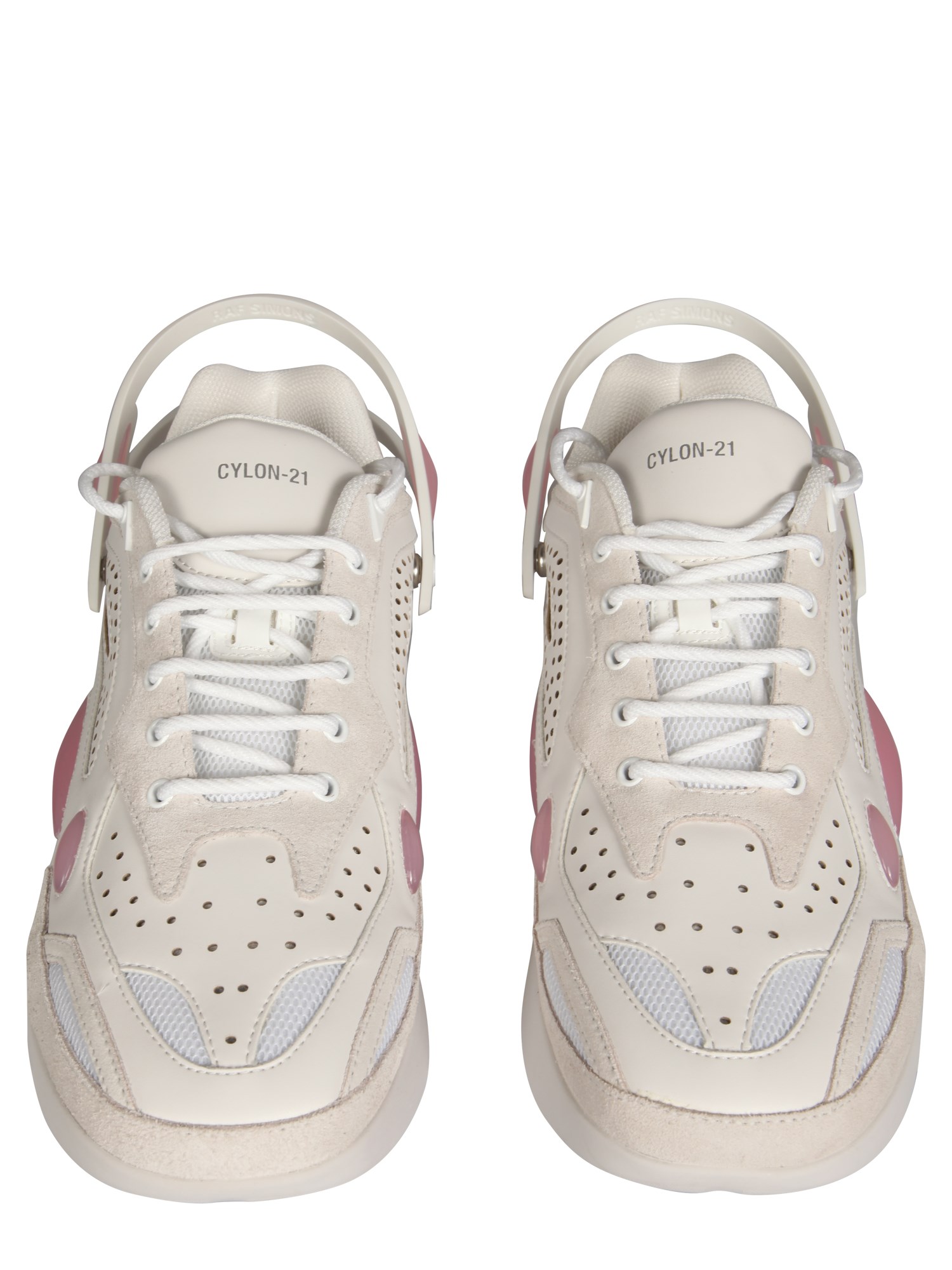 Level up your casual style by wearing the Cylon-21 sneakers from Raf Simons. The everyday sneakers feature tubular laces closure and a rubber sole. It has leather and a techno upper. The regular-fit sneakers have a comfortable padded footbed. It includes two interchangeable plastic details to apply on the back.