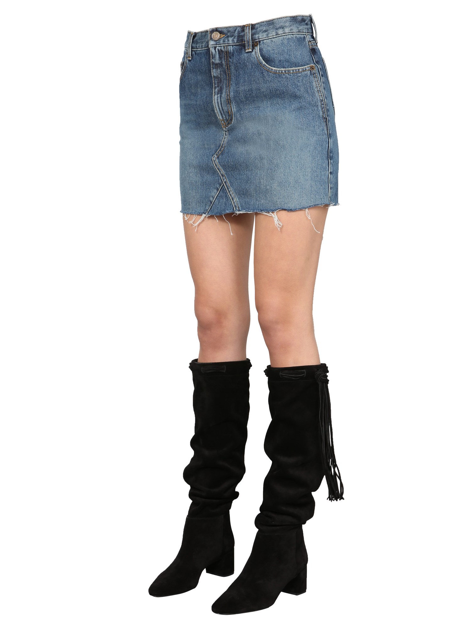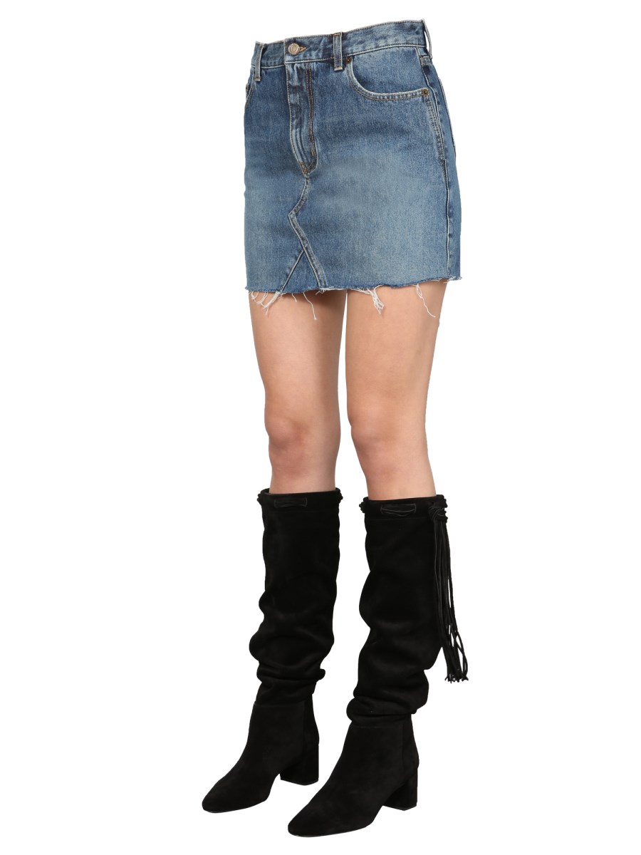 Skirts like this cotton denim skirt are the staple every wardrobe out there. Saint Laurent. This cotton denim skirt flaunts slim-fit design and lands near the lower hip, which is perfect to show some skin when the temperature is rising. All you need is a basic tank top or tee to complete the look.
