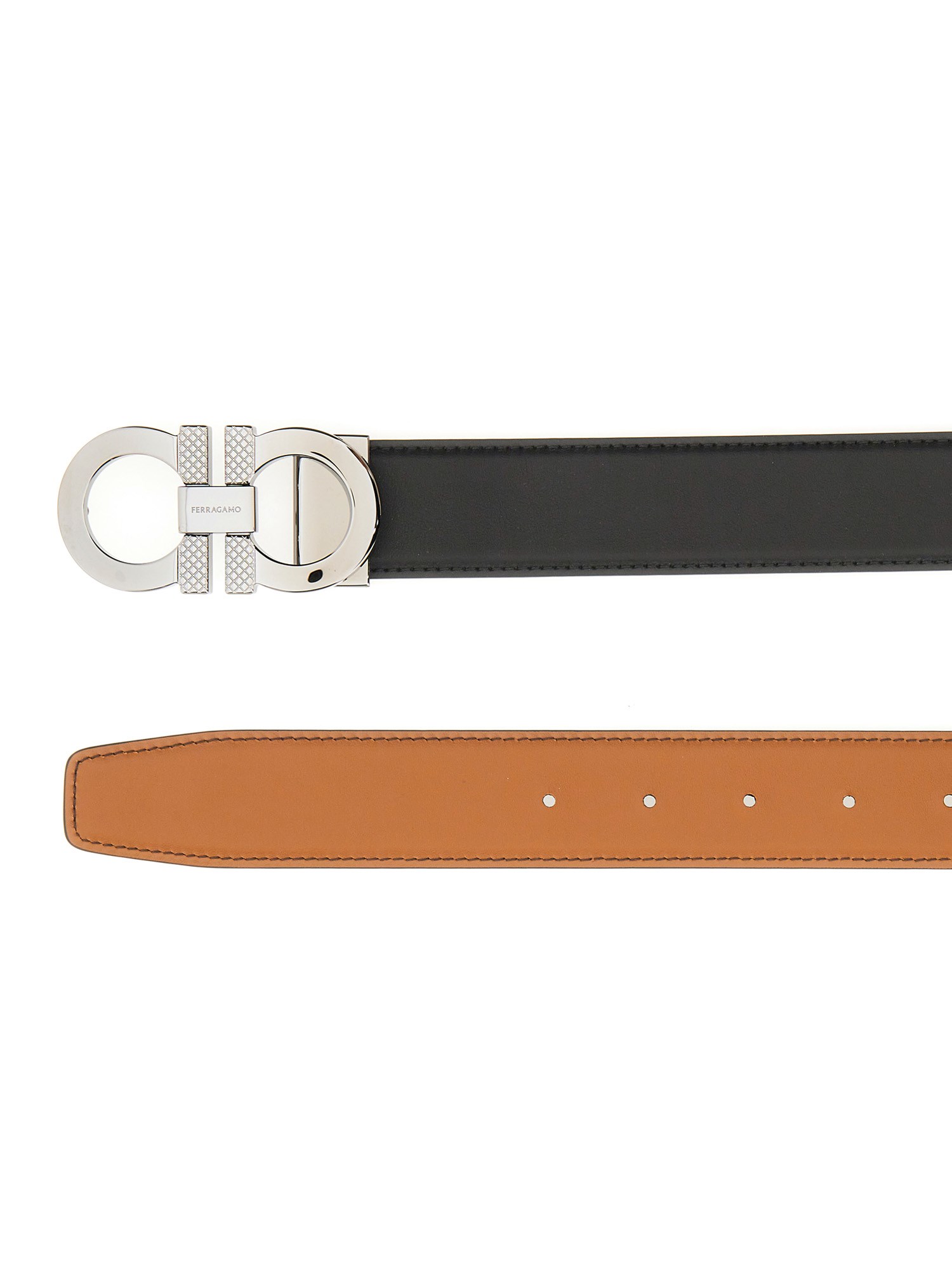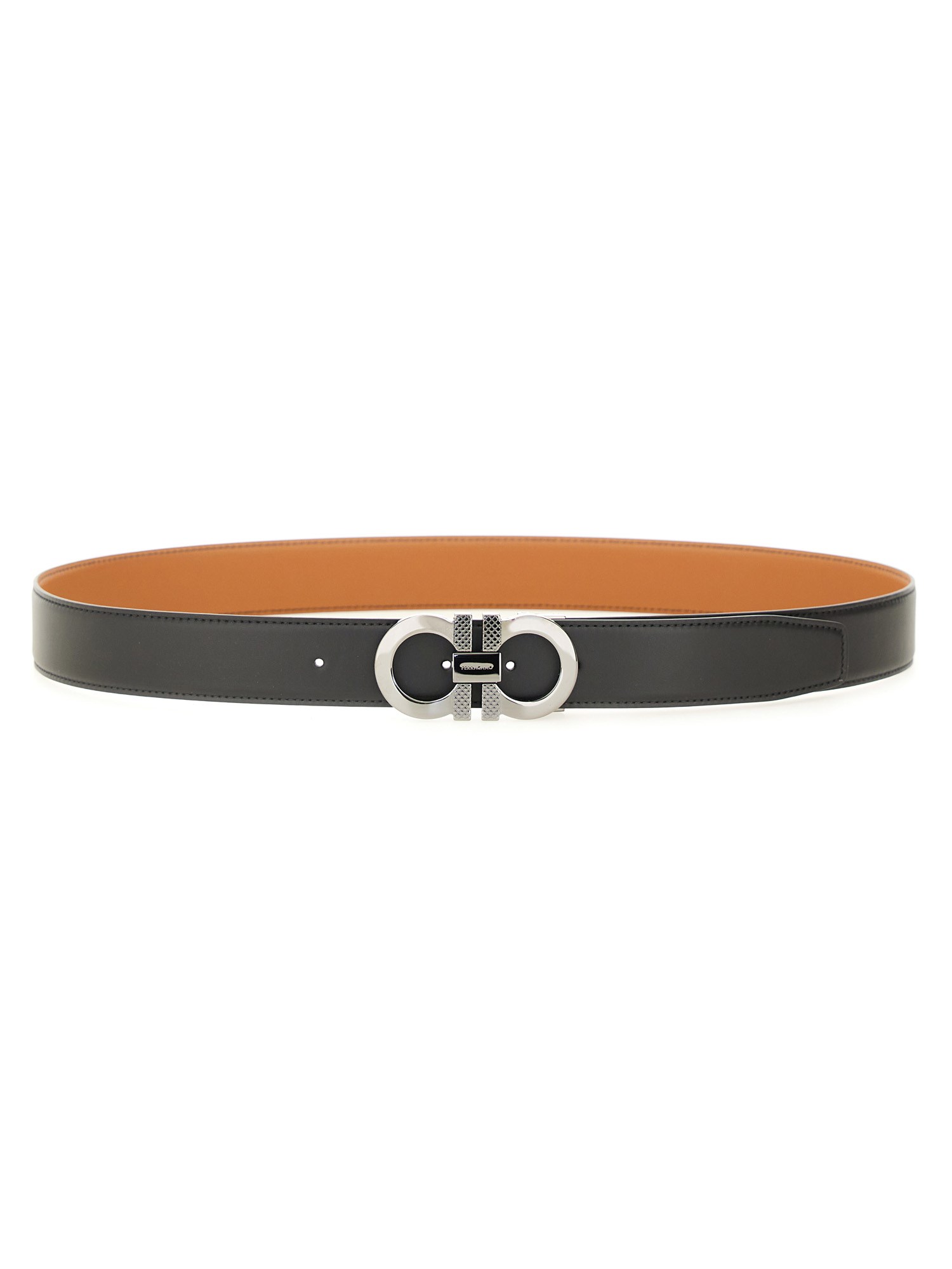 Fate un figurone con la cintura reversibile in pelle di vitello con ganci di Ferragamo. Realizzata in morbida pelle di vitello, questa cintura offre il massimo dello stile e della versatilità. Il design reversibile permette di passare dal nero al marrone, rendendola un'aggiunta versatile al vostro guardaroba. Completa di eleganti ganci, questa cintura è un accessorio indispensabile per ogni individuo alla moda.
