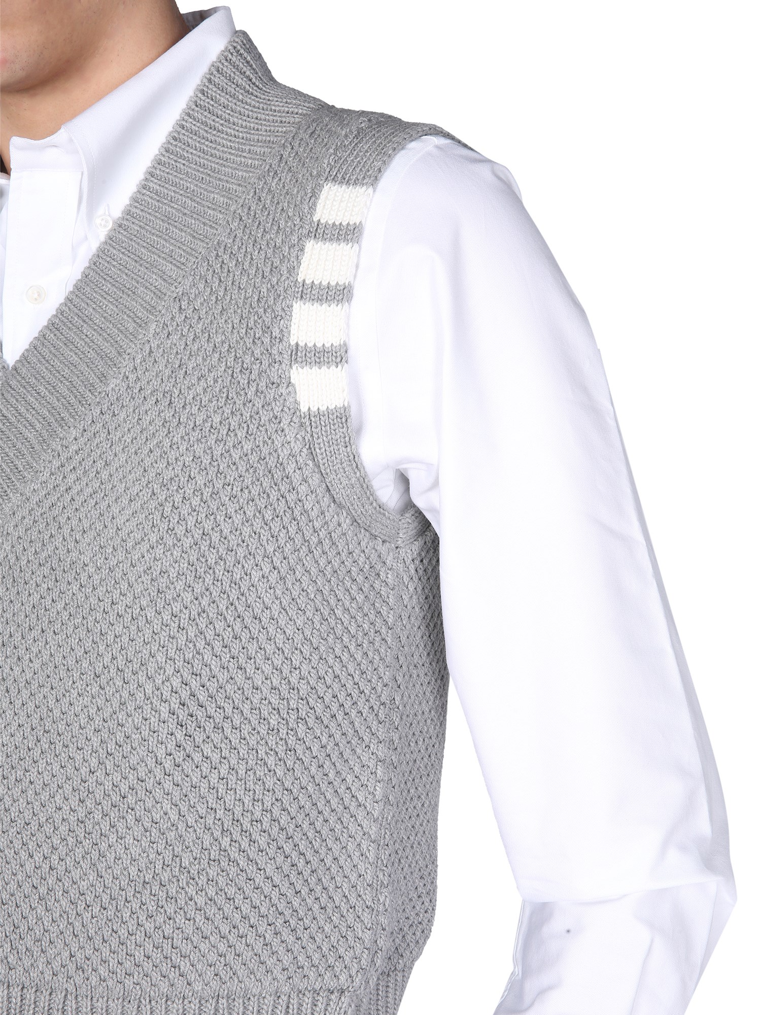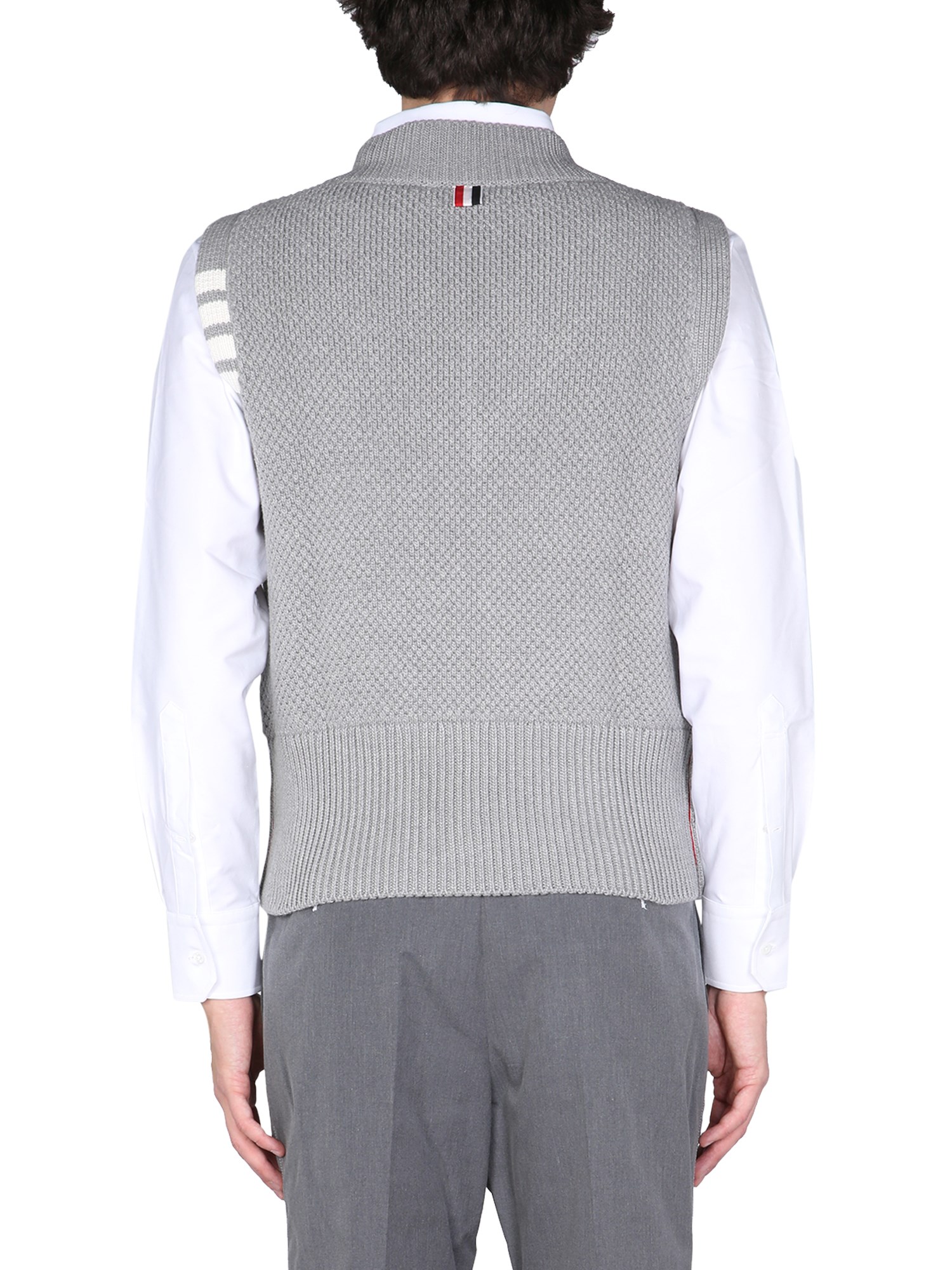 - V-NECK- FRONT 4BAR INLAY- TWO SLITS ON THE BOTTOM WITH BUTTONS- 95% COT0NE, 5% POLYAMIDE- MADE IN ITALY- MODEL IS 185CM TALL AND WEARS SIZE 3 JP