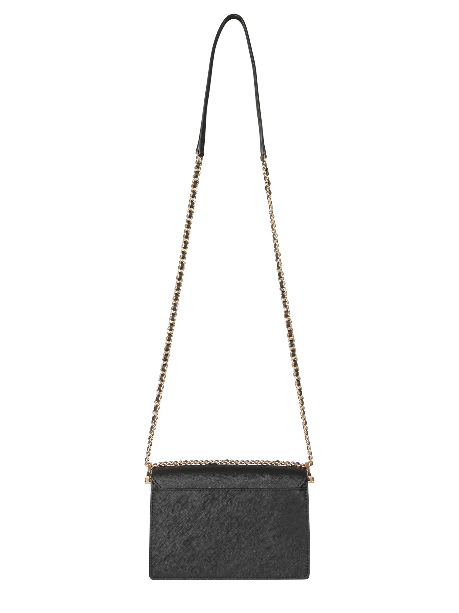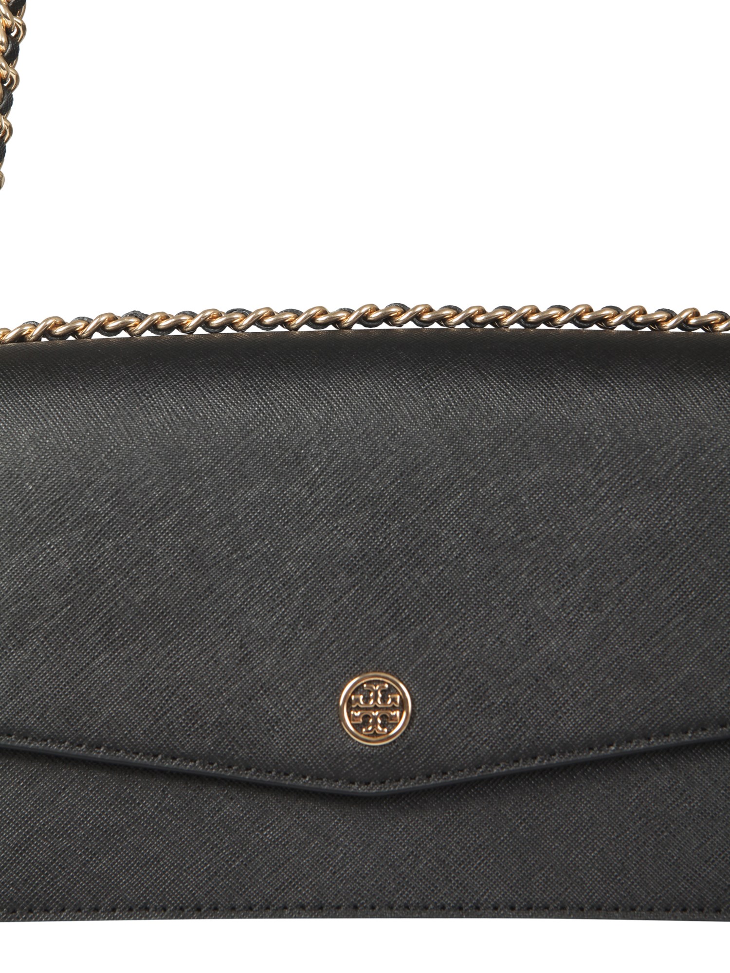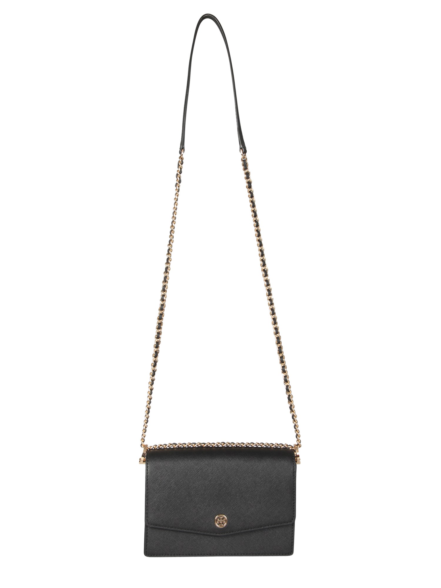 A fashion accessory that accentuates all your looks, the Mini Robinson Saffiano leather bag with polyurethane coating from Tory Burch. The leather construction bag features an automatic button closure and an outer pocket. It has a chain shoulder strap with a leather insert and a lined inner with two compartments and two slot card pockets. The front logo palate and gold finish metal accessories complete the look of the bag.