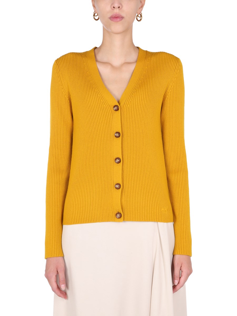 - V-NECK- FRONT BUTTON CLOSURE- RIBBED - 94% MERINO WOOL, 1% ELASTANE, 5% OTHER FIBERS- MODEL IS 180 CM TALL AND WEARS SIZE S