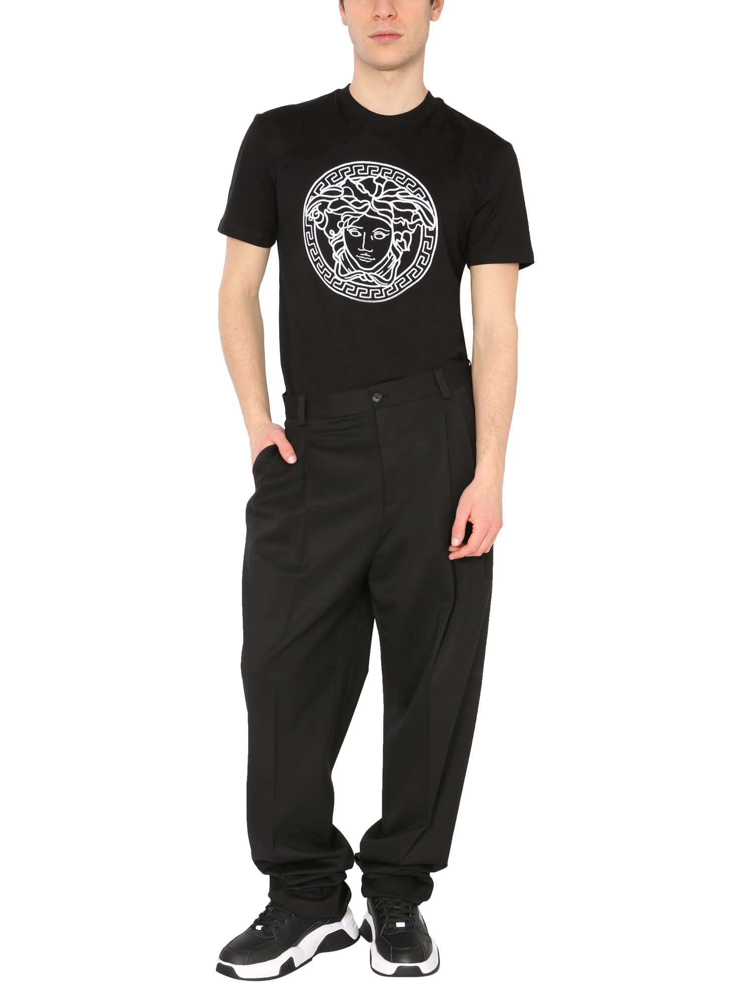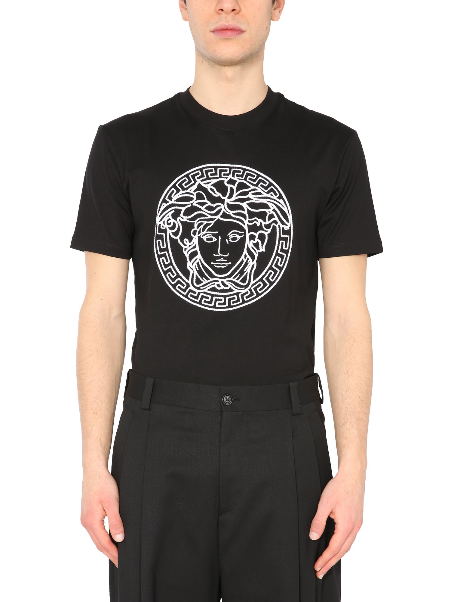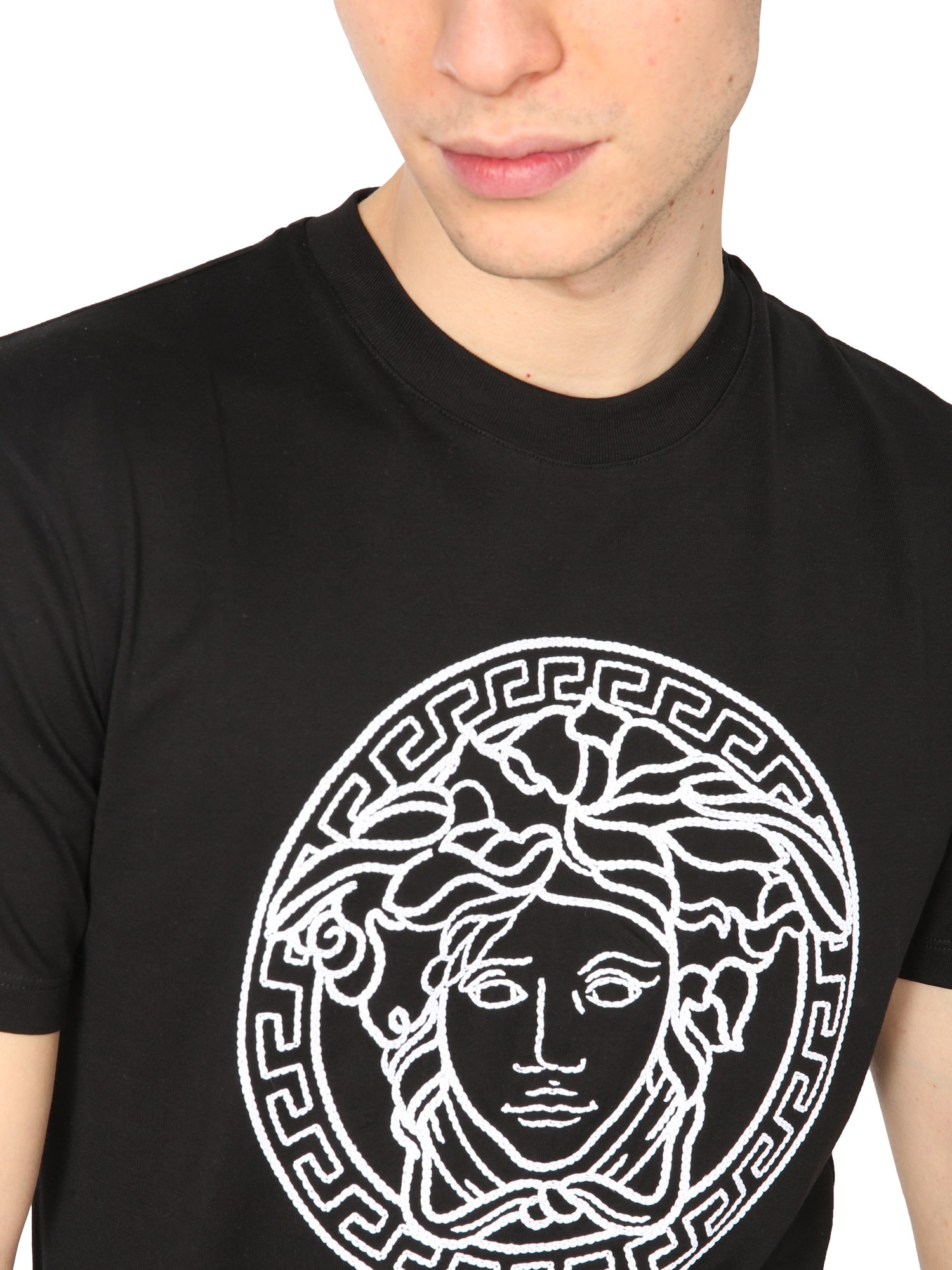 Opt for the classic, and always on point T-shirt by Versace Jeans Couture. The soft single-cotton jersey T-shirt features a crew neckline with a Lurex stripe and short sleeves. The regular fit is eased, but not sloppy, and perfect for any activity. The front of the T-shirt is adorned with a logo print.