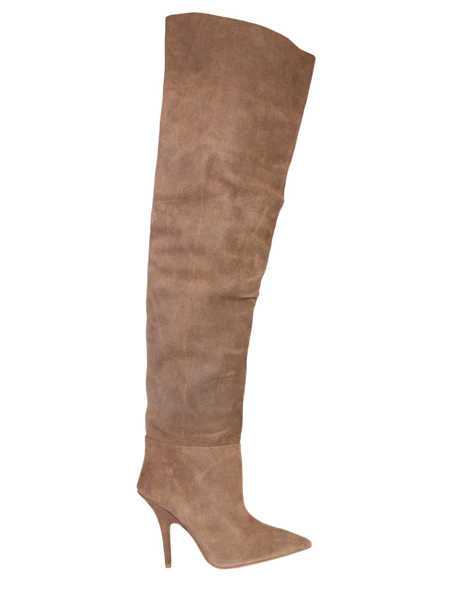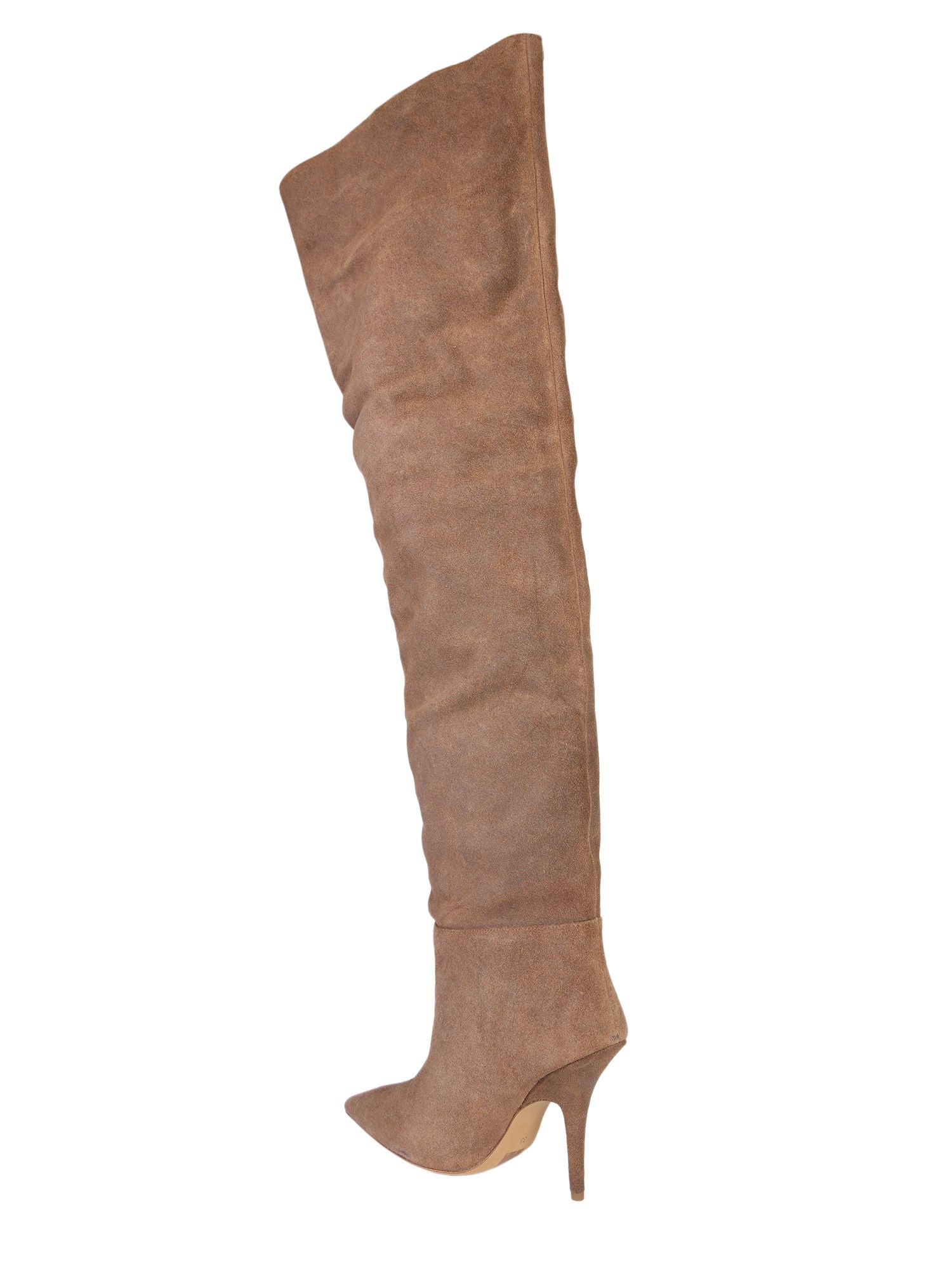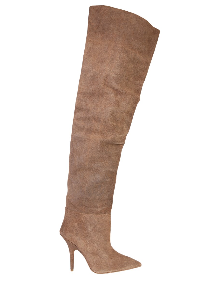 Crafted in genuine leather, these high boots are produced under the label of Yeezy Season 7. Designed with pointed toe, thigh-high shaft, and stiletto heels, these boots are ready for the club tonight. Soft leather lining and insole are all about comfort and luxury. Treading on a complementing leather outsole, the boots are best match for your fur coat and midi dress.